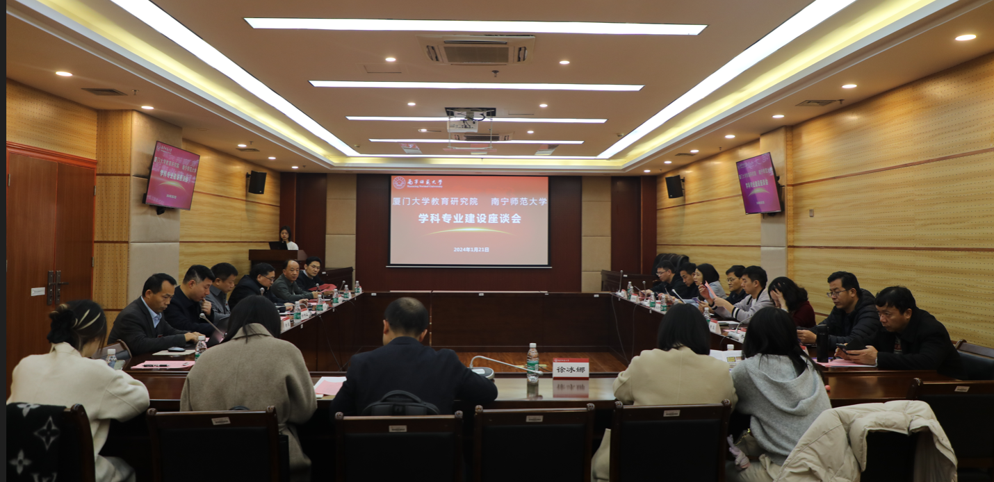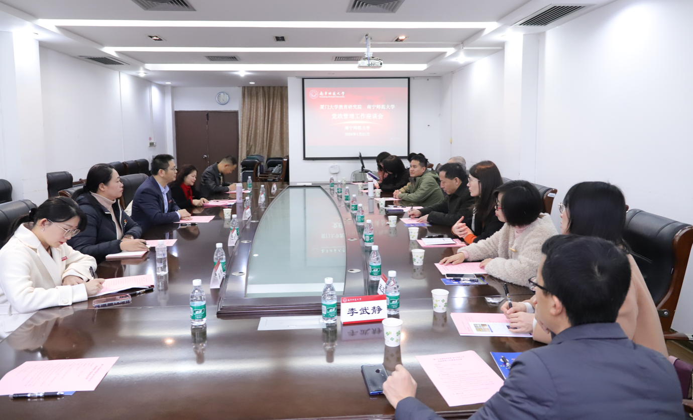 1月21日上午,厦门大学教育研究院党委刘振天书记、郭建鹏副院长一行25人到我校开展调研交流。学校党委副书记隆广庆、副校长徐书业、校长助理杨毅以及教育科学学院主要负责人等参加调研会。调研会分党政管理组和学科专业建设组两组同时进行,分别由教育科学学院党委庞芳书记、院长李强主持。
