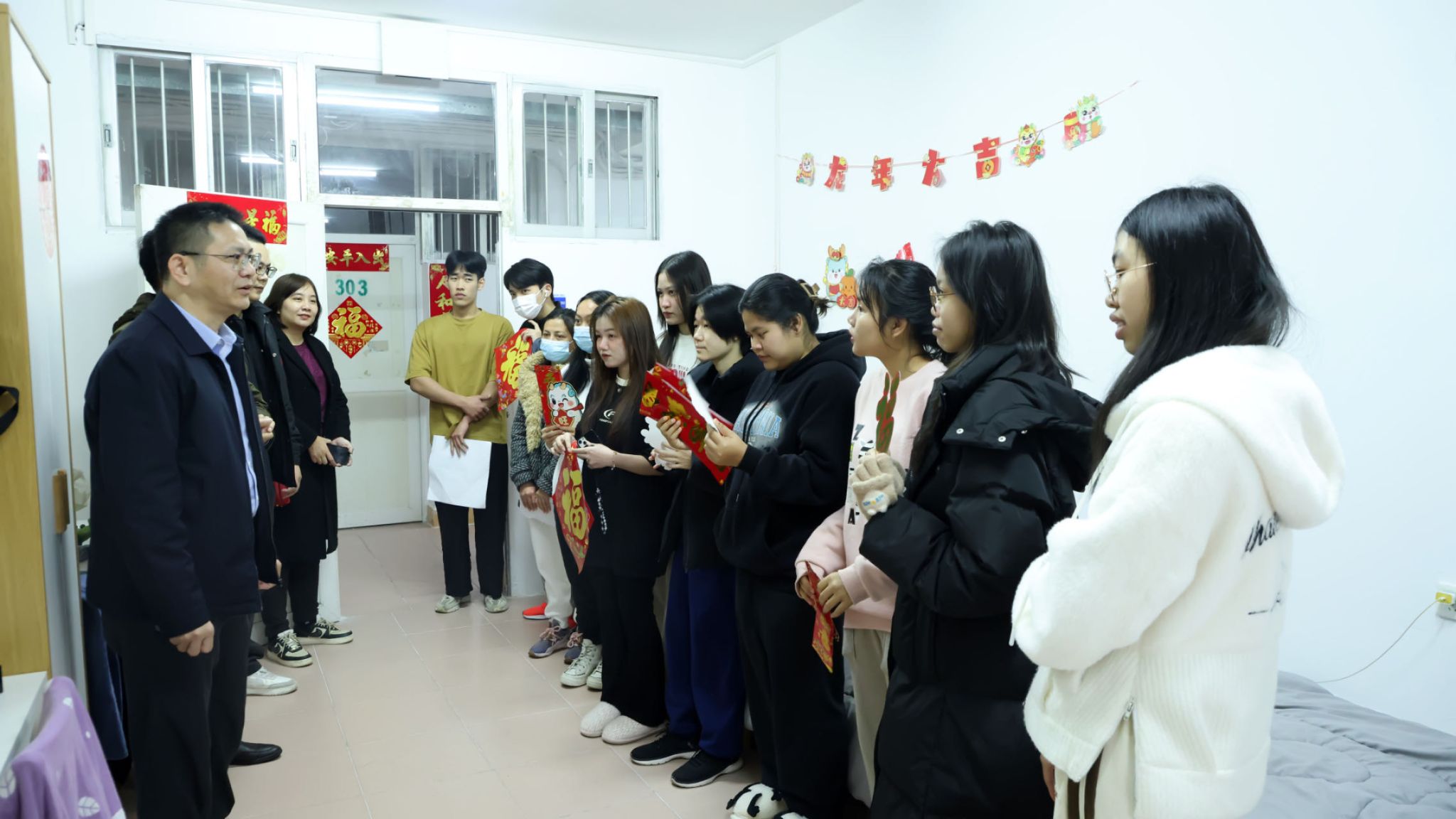 2月6日,在新春佳节来临之际,学校党委隆广庆副书记和国际教育学院的党政领导们,来到留学生宿舍,看望寒假期间留校的学生,了解同学们的学习生活情况。