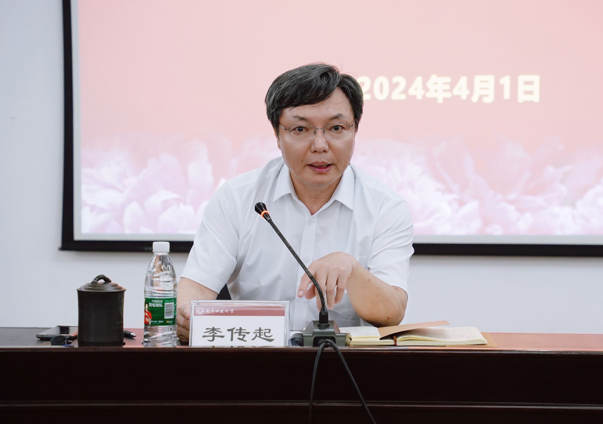 最后,李传起校长作部署讲话。李校长指出,学校已进入全面迎接新一轮本科教育教学审核评估关键攻坚阶段,全校上下要进一步统一思想、形成合力,全力以赴做好新一轮审核评估工作,为此,他提出三点意见:一是要认识到位,坚定信心。要提高站位,充分认识到本轮教育教学审核评估工作的重要意义与引领作用,新一轮审核评估的过程本身就是引领、指导学校本科教育教学高质量发展的指挥棒,是发现学校本科教育教学短板并落实持续改进理念的重要手段,也是向国内同行宣传学校办学特色的重要契机。二是要全力以赴,压实责任。学校迎评工作没有旁观者,要做好再动员再部署,抓住迎评工作中核心任务和关键环节,系统梳理学校本科教育教学工作的成绩,凸显学校本科教学办学的优势特色,要敢于面对存在问题深入分析寻找改进策略,统筹推进评建工作各项任务。三是要积极准备,有序推进。全校上下要加强学习,把握审核评估指标内涵。各学院院长要担负起学院评估第一责任人的职责,带领师生对学院办学作系统分析总结,做好学院自评报告并准备好相关的汇报PPT,抓好课堂教学质量等,把评建的各项工作任务做实、做精、做细,齐心协力做好迎评促建各项工作。