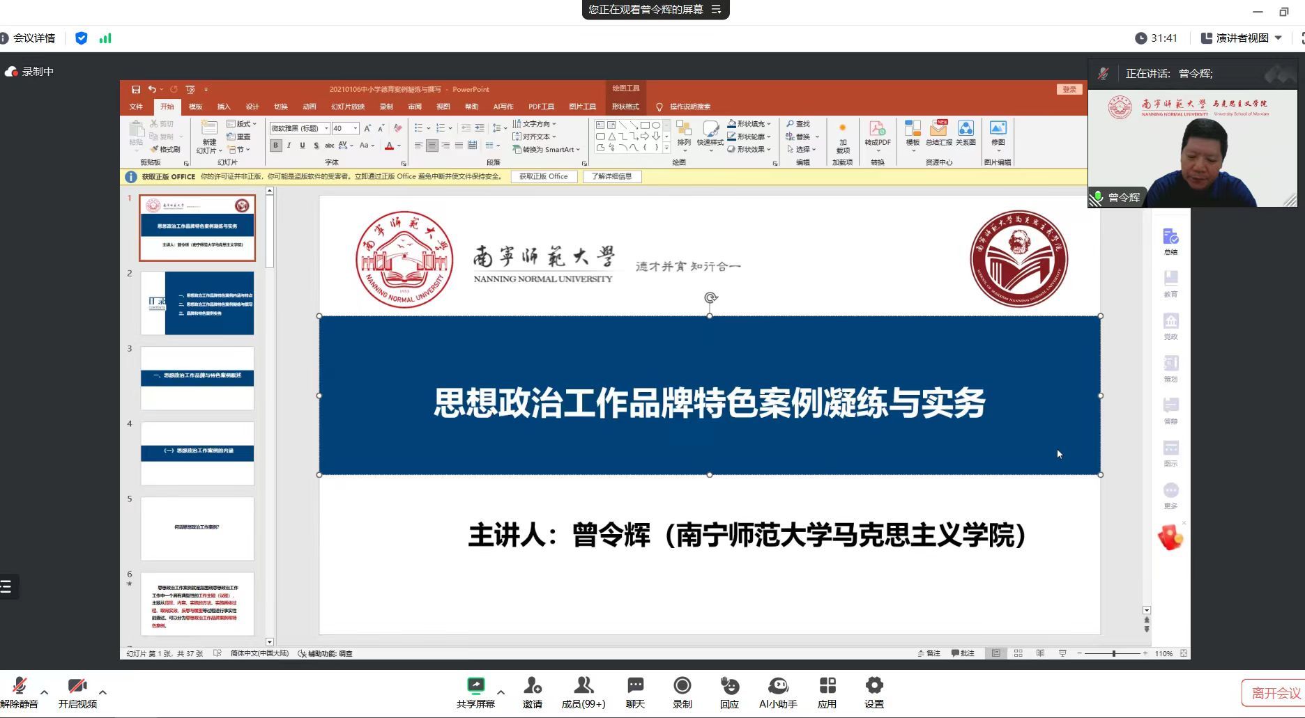 为做好高校网络课程和工作案例项目遴选与培育工作,及时向教育部高校辅导员队伍能力提升大数据赋能平台推送精品课程和案例,4月17日晚,高校思想政治工作队伍培训研修中心(南宁师范大学)以网络视频会议形式召开了高校思政网络课程和工作案例建设专题培训会。来自30多所高校的申报网络课程和工作案例项目的辅导员、100余名思政课教师参会。培训研修中心副主任、马克思主义学院院长、博士生导师曾令辉教授参加会议,并对与会者进行了专题培训和辅导。