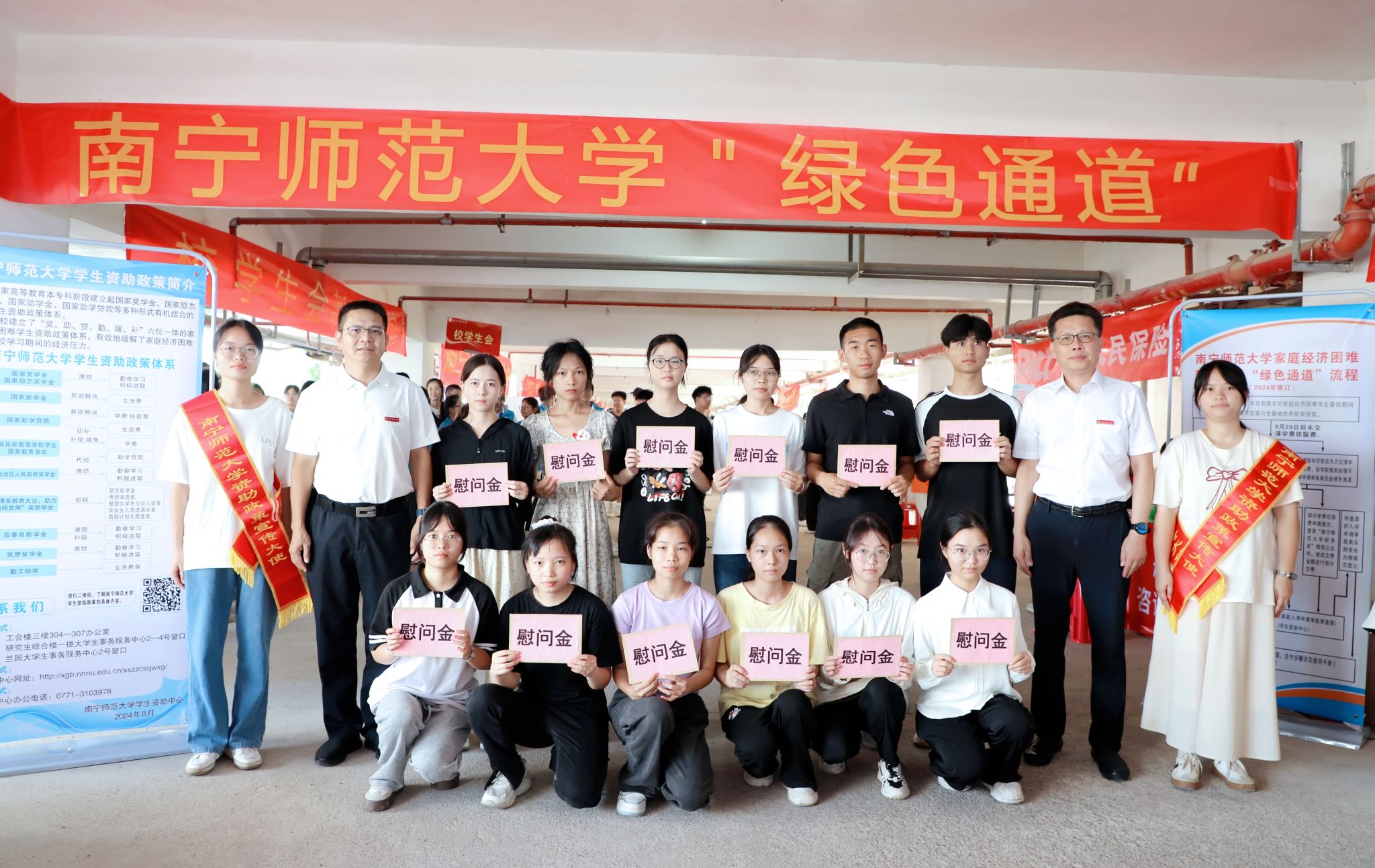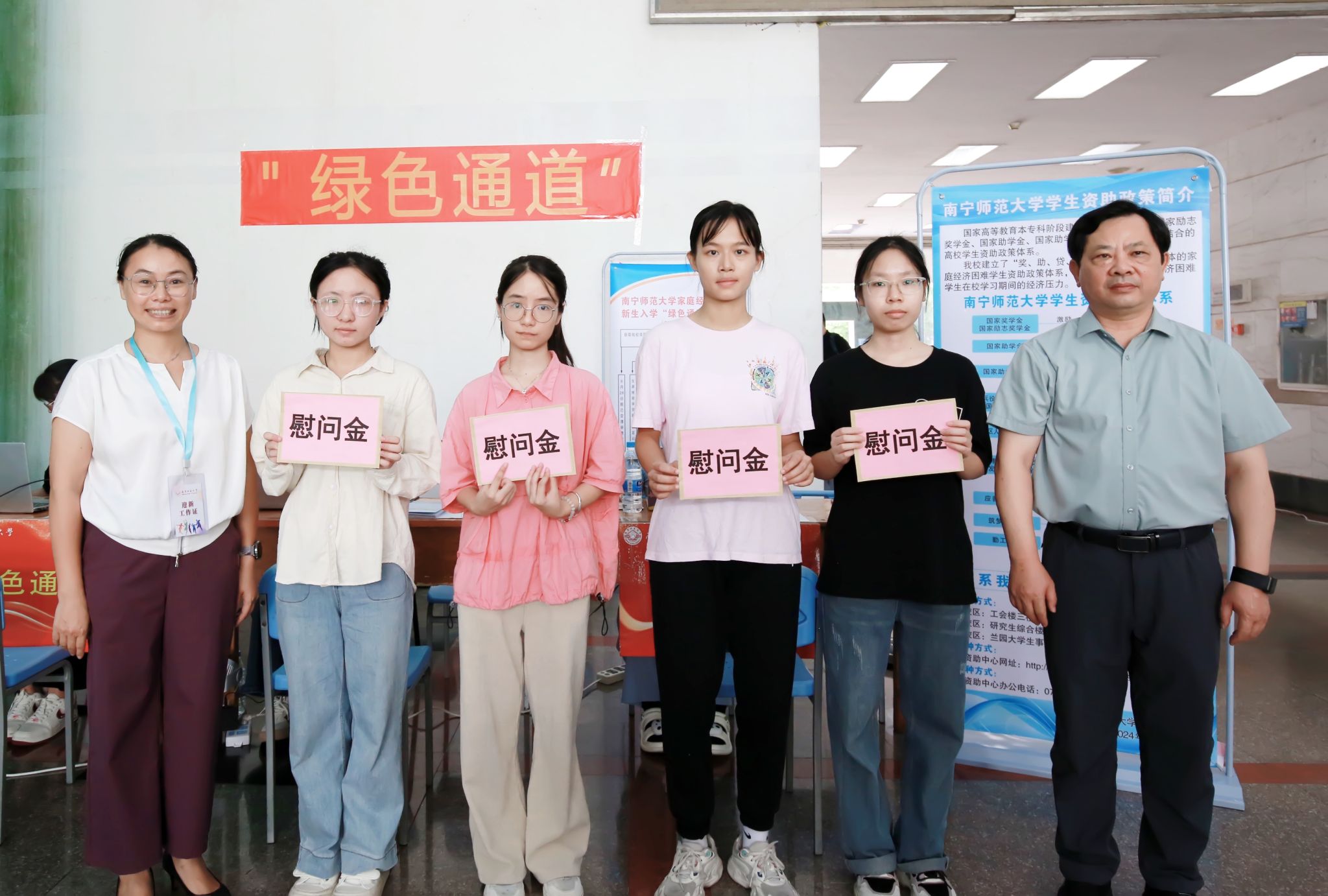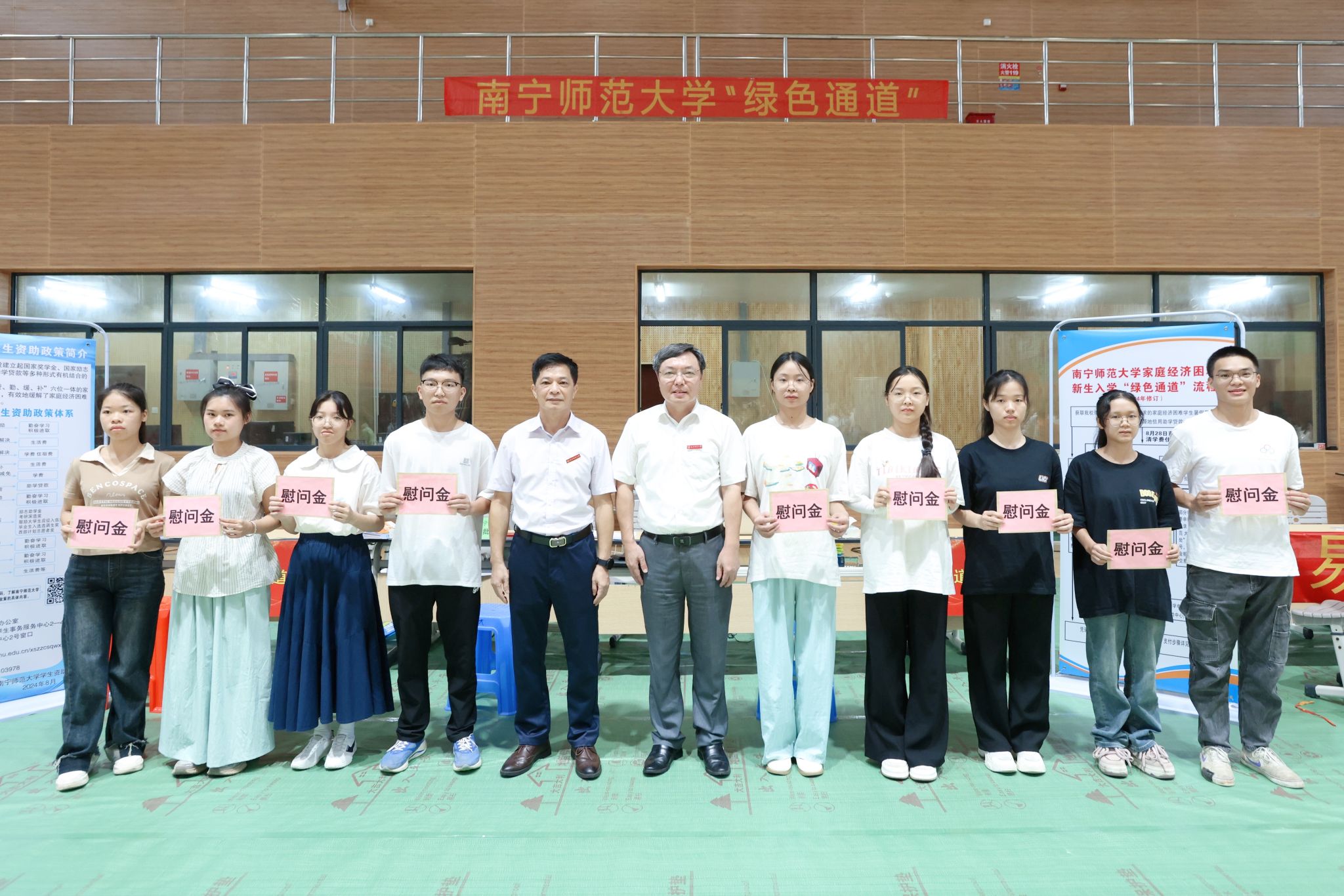 校领导来到家庭经济困难新生入学“绿色通道”,为贫困生代表发放了慰问金并合影,勉励他们在大学阶段克服困难、自立自强、刻苦学习、回报社会。