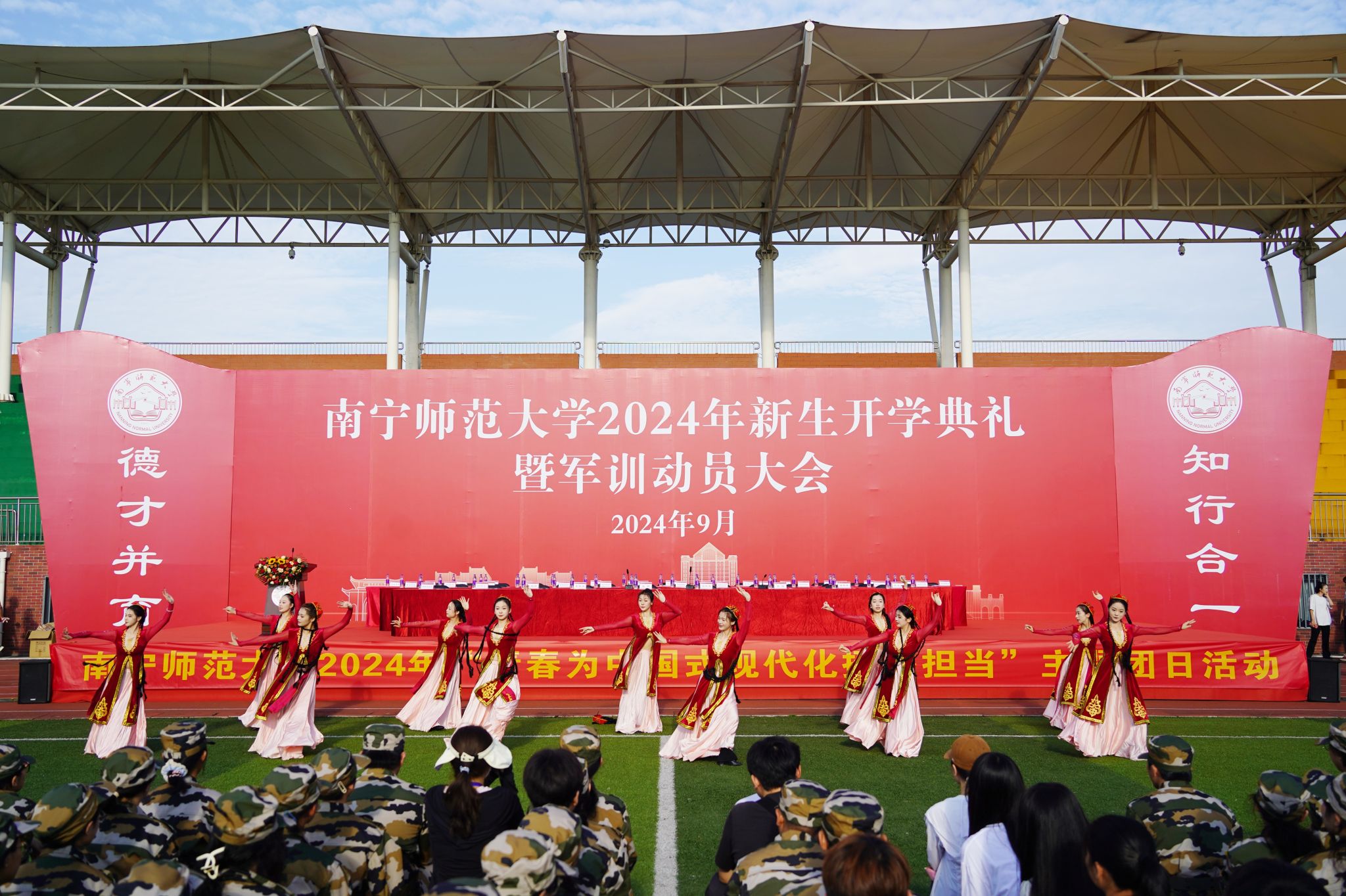 “挺膺担当,强国有我!”2024级新生挥舞国旗、花球,高声明志,向祖国表白,嘹亮的口号响彻南宁师大校园。这是大会开始前,学校精心组织的“青春为中国式现代化挺膺担当”主题团日活动中的一幕。期间,还表演了歌曲《New Boy》、《民族舞串烧》、歌曲《逐梦未来》《领航》……一个个青春飞扬、振奋人心的节目点燃了现场的气氛。随后,大会在高亢激昂的国歌声和悠扬嘹亮的校歌声中正式拉开帷幕。
