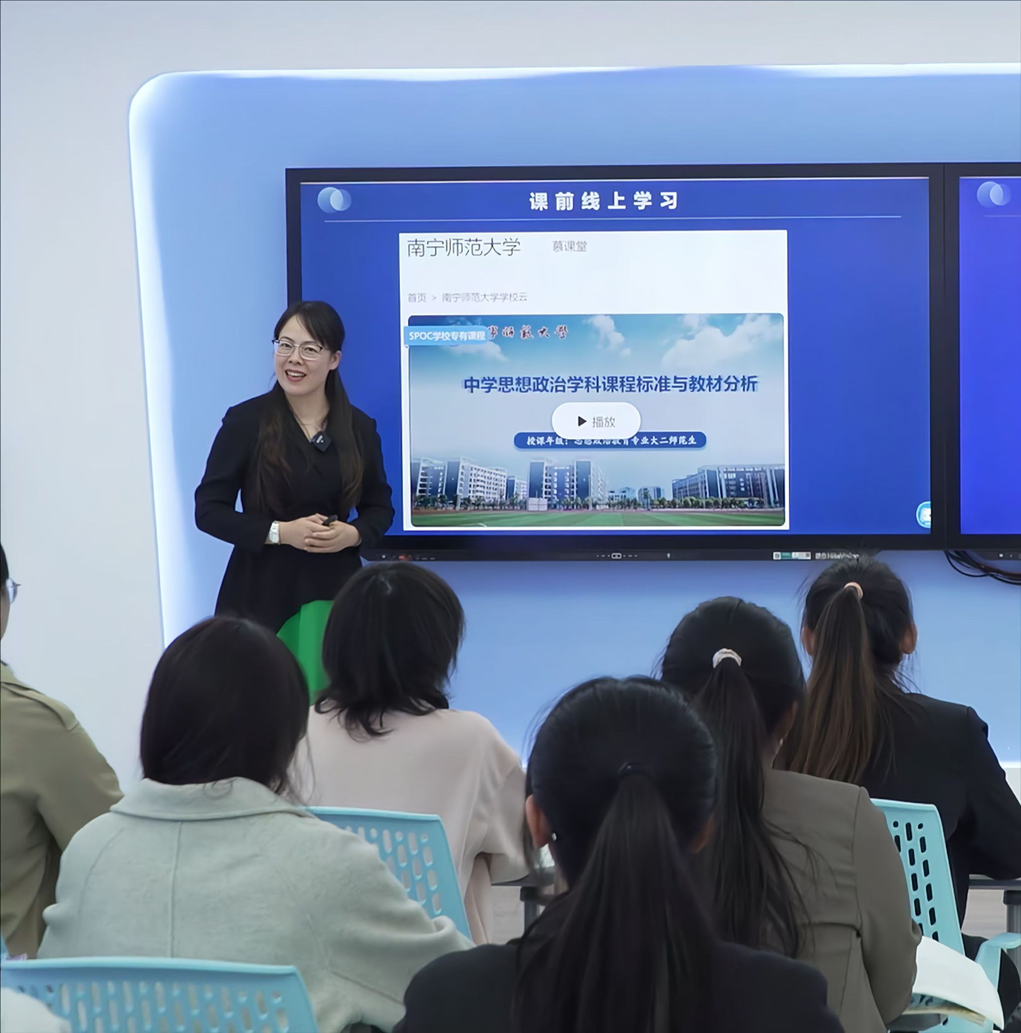 习近平总书记在学校思想政治理论课教师座谈会上强调:要把统筹推进大中小学思政课一体化建设作为一项重要工程,推动思政课建设内涵式发展。以习近平总书记重要讲话精神为指引,温向莉申报获批建设自治区级“大中小学思政课一体化建设虚拟教研室”,依托该虚拟教研室,她联合中小学思政课教师组建了“行走的教研共同体”,助力广西大中小学思政课一体化建设。