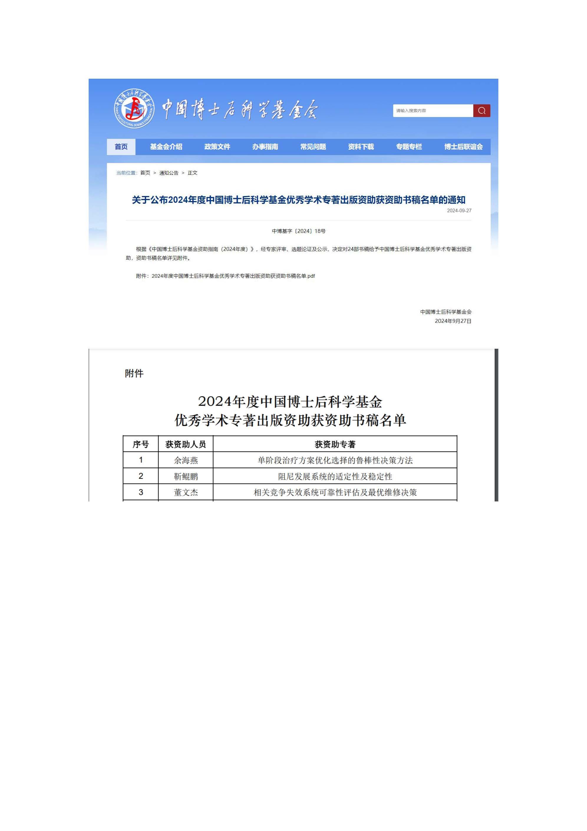 近日,中国博士后科学基金会发布了2024年度中国博士后科学基金优秀学术专著出版资助书稿名单。根据《中国博士后科学基金资助指南(2024年度)》的要求,经过专家评审和选题论证,全国共有24部优秀学术专著获得出版资助,我校数学与统计学院靳鲲鹏副教授的书稿《阻尼发展系统的适定性和稳定性》名列其中。这是我校首次获得博士后优秀学术专著出版资助,实现了我校在该资助领域的突破。