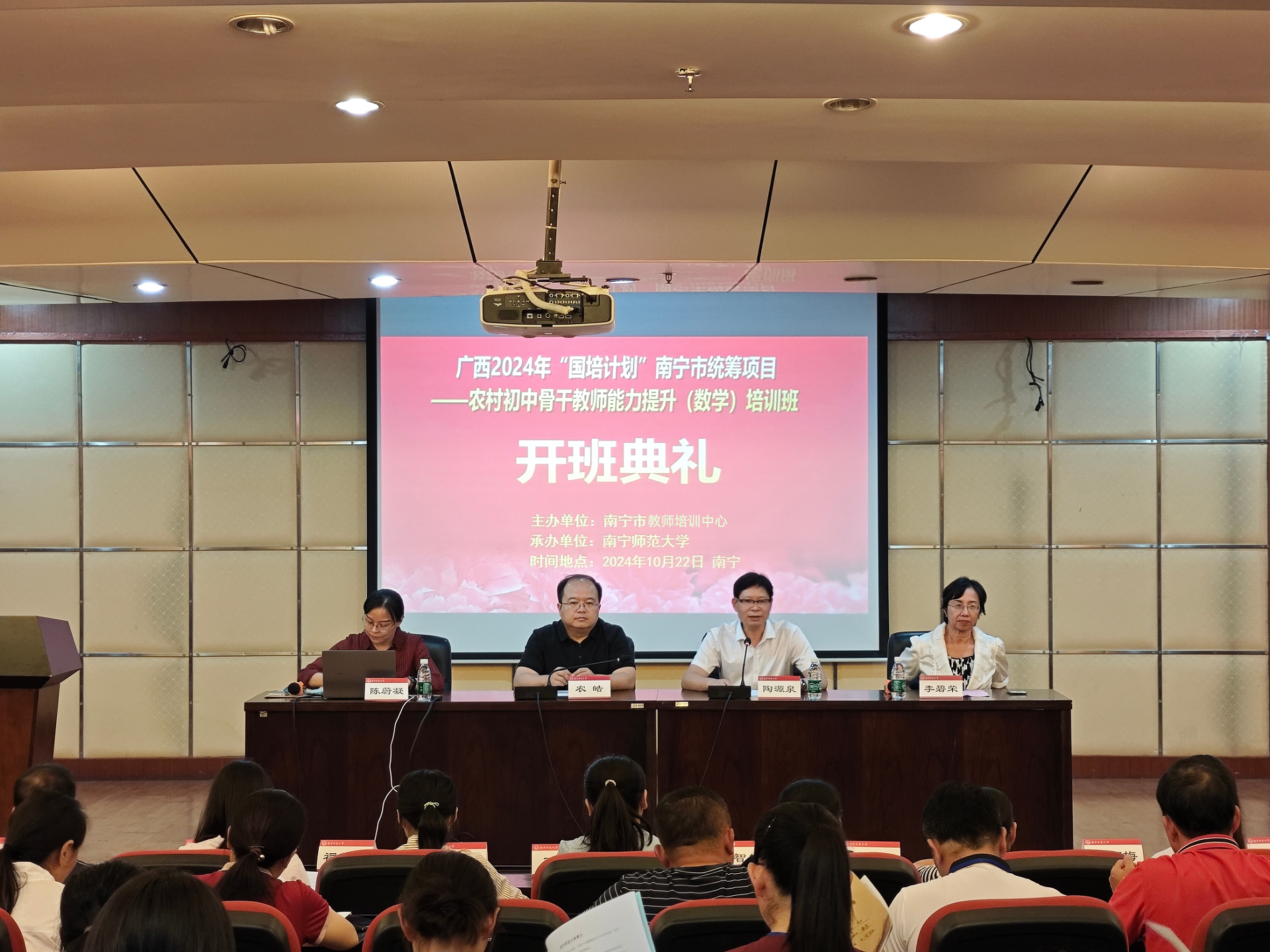 10月22日,由我校承办的广西2024年“国培计划”南宁市统筹项目——农村初中骨干教师能力提升培训班(数学)在我校顺利开班。我校教师教育学院、南宁市教师培训中心的相关负责人,以及来自南宁市邕宁区、武鸣区、隆安县、马山县、上林县、宾阳县和横州市的160名农村初中数学骨干教师参加了此次培训。