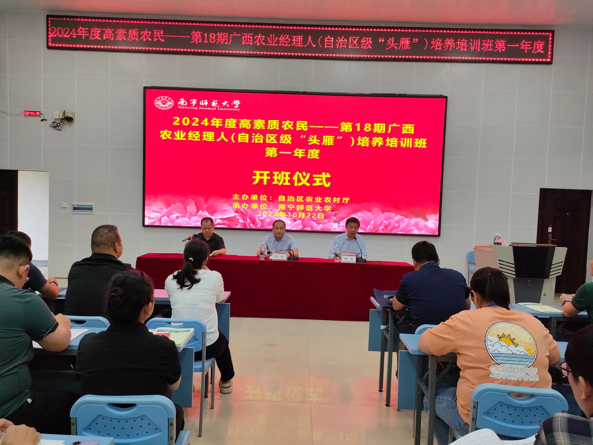 10月21日-28日,由自治区农业农村厅主办,南宁师范大学继续教育学院承办的2024年度高素质农民——第18期广西农业经理人(自治区级“头雁”)培养培训班在学校明秀校区成功举办,来自全区各地市的112名学员参加了培训。自治区农业农村厅农村社会事业促进处三级调研员罗云、学校继续教育学院院长徐健出席了开班仪式。