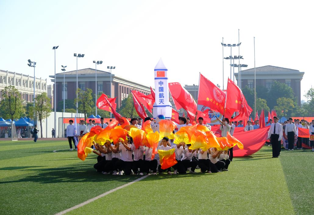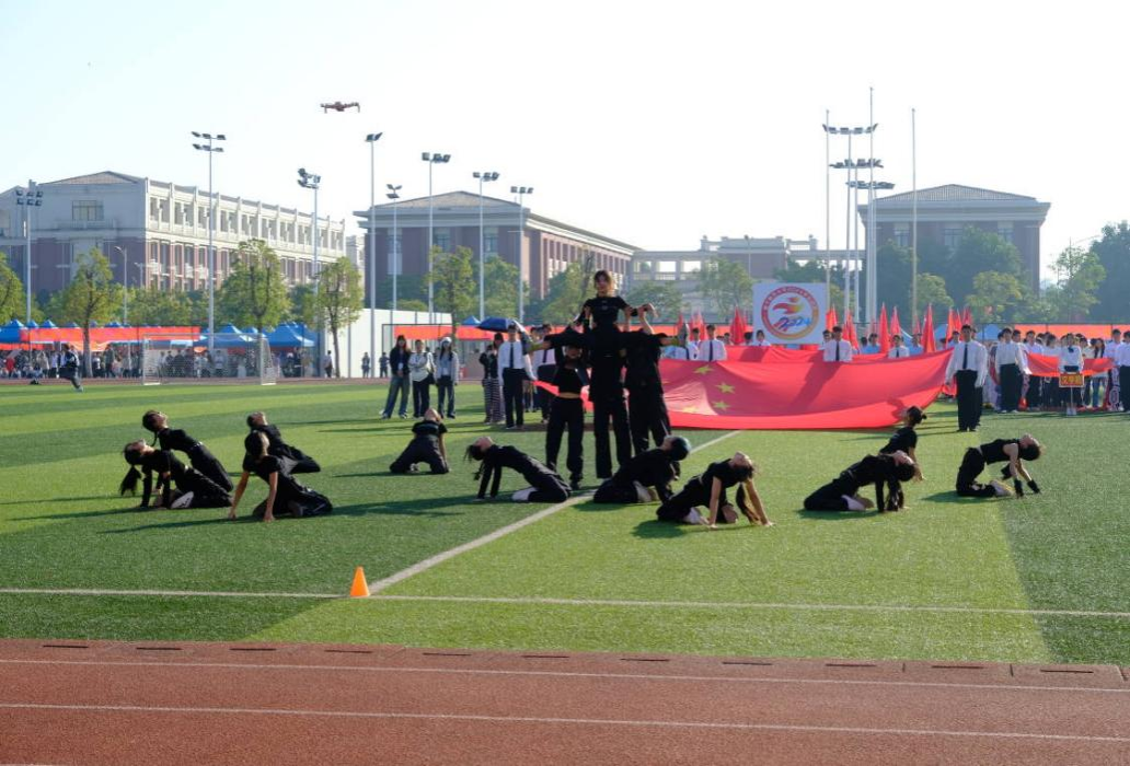 彩旗飘扬,华彩绽放;鸣鼓铮铮,喧响热闹。入场式中,各学院方块队进行了精彩的文艺驻停表演,有创意十足的服装秀、热情奔放的啦啦操、技艺精湛的舞狮、绚丽多彩的民族群舞和古风群舞等,独具匠心的艺术形式为现场师生带来一场视觉盛宴,赢得了阵阵喝彩。“强国有我,青春有为”“明德至善,青春激越”“格物致知,快乐无限”“方阵亮相,锐不可当”“志存高远,奋勇争先”……二级学院方块队高亢嘹亮的口号响彻在运动场上空。