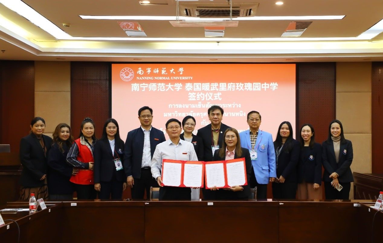 随后,在图书馆二楼会议室召开南宁师范大学与泰国暖武里府玫瑰园中学座谈会,与会双方一同观看了两校宣传专题片,围绕教师培训、学生实习等方面开展合作进行了深入交流,我校与泰国暖武里府玫瑰园中学签订了教育合作备忘录。