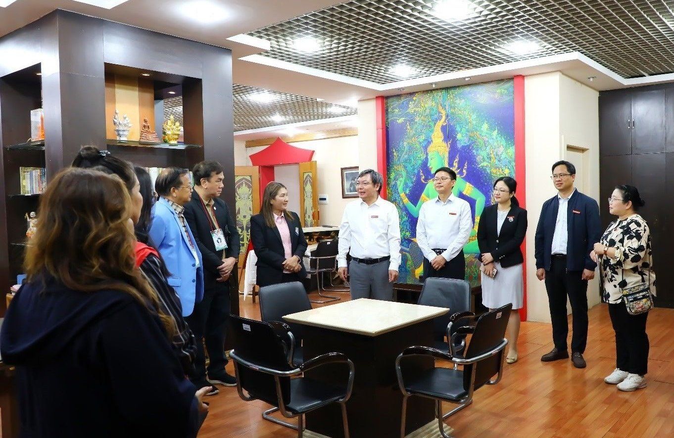 11月5日上午,泰国暖武里府玫瑰园中学CHAROONJARUSAN校长一行11人到我校交流访问。学校李传起校长、国际交流合作处/国际教育学院相关负责人及工作人员在明秀校区泰语中心接待了泰国代表团一行。