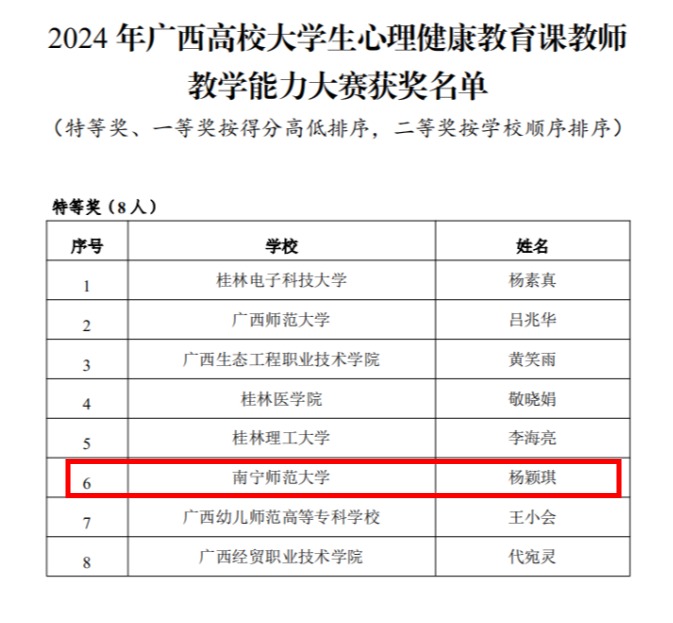 近日,自治区教育厅公布了2024年广西高校大学生心理健康教育课教师教学能力大赛获奖名单,我校心理健康教育咨询中心杨颖琪老师荣获教学能力大赛特等奖。