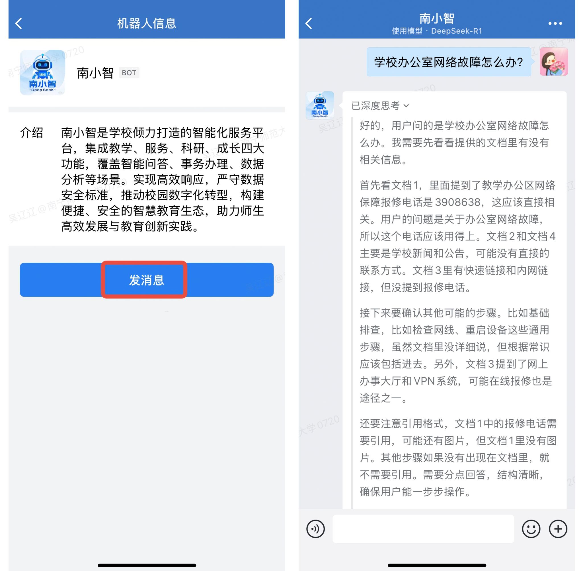 双端流程便捷使用。师生可通过企业微信平台轻松接入“南小智”服务,具体使用方法如下: