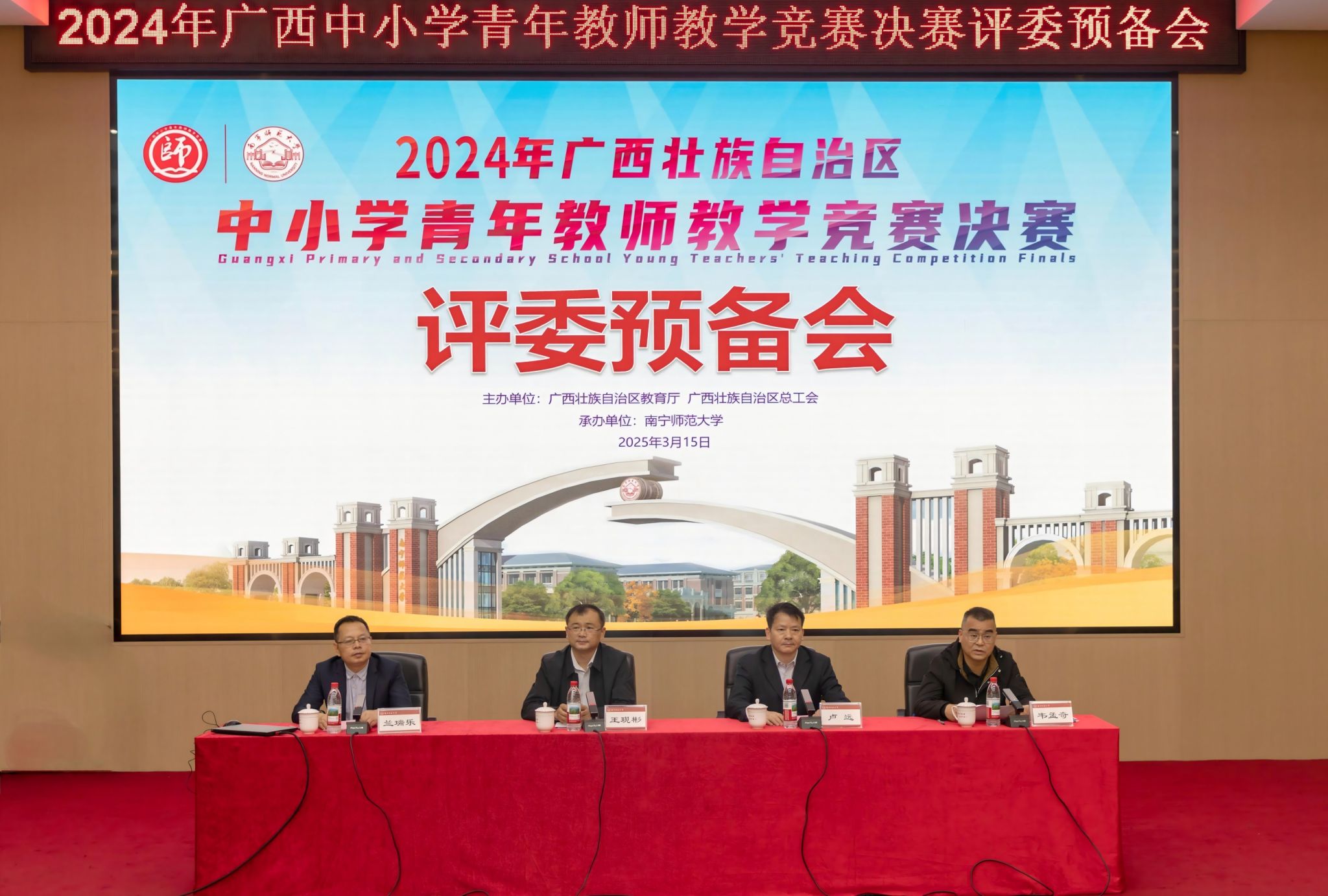3月15—16日,由广西壮族自治区教育厅和广西壮族自治区总工会主办、我校承办的2024年广西中小学青年教师教学竞赛决赛在明秀校区成功举办。自治区教育厅教师工作处副处长王现彬、自治区教育工会主席韦孟奇、南宁师范大学副校长卢远出席并讲话。