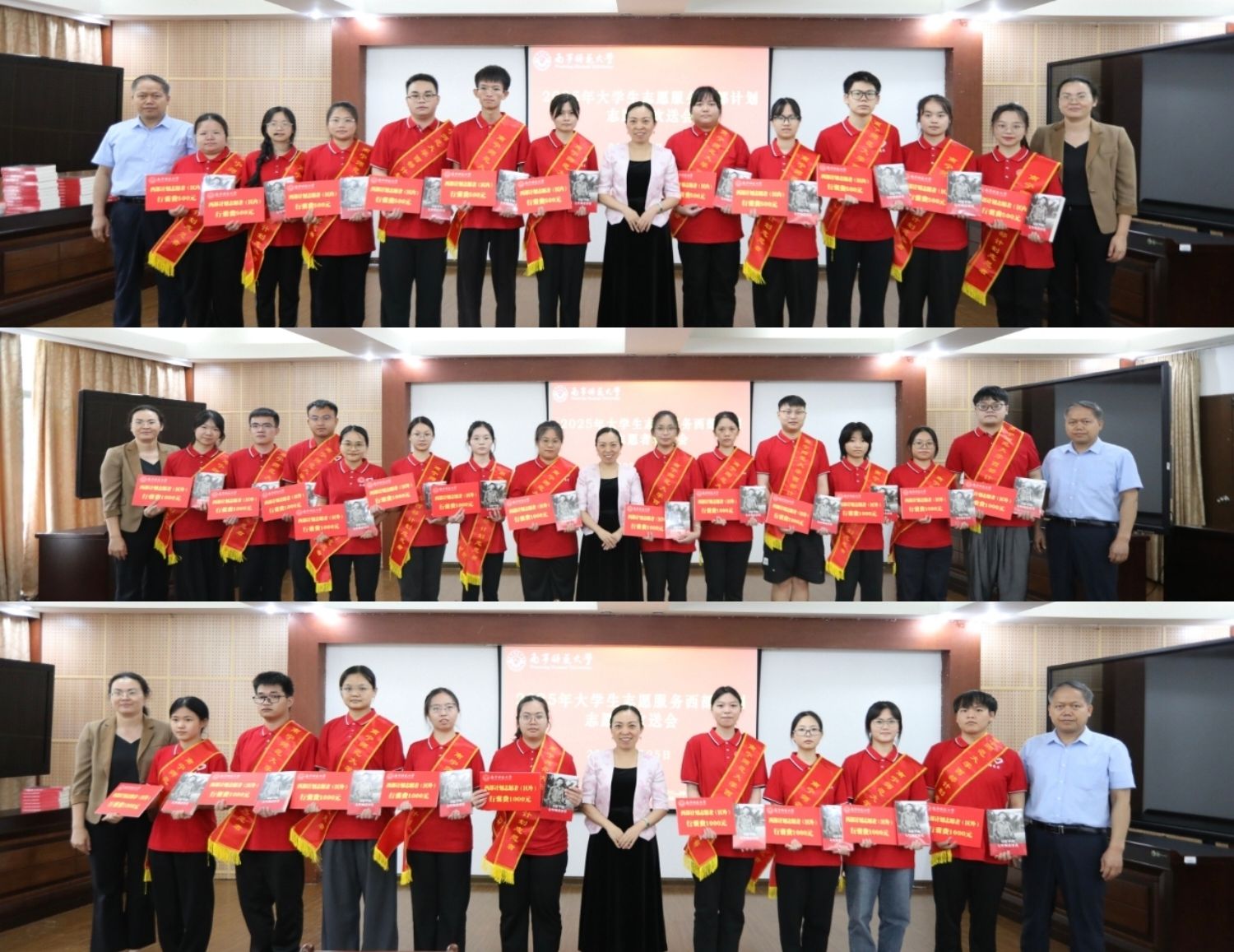 盛夏时节,青春激昂。6月25日上午,我校在明秀校区鸿远楼409举行2025年大学生志愿服务西部计划志愿者欢送会。学校副校长龙妮娜,党委学生工作部、校团委负责人,各学院党委副书记、团委书记及33名2025年西部计划志愿者参会。