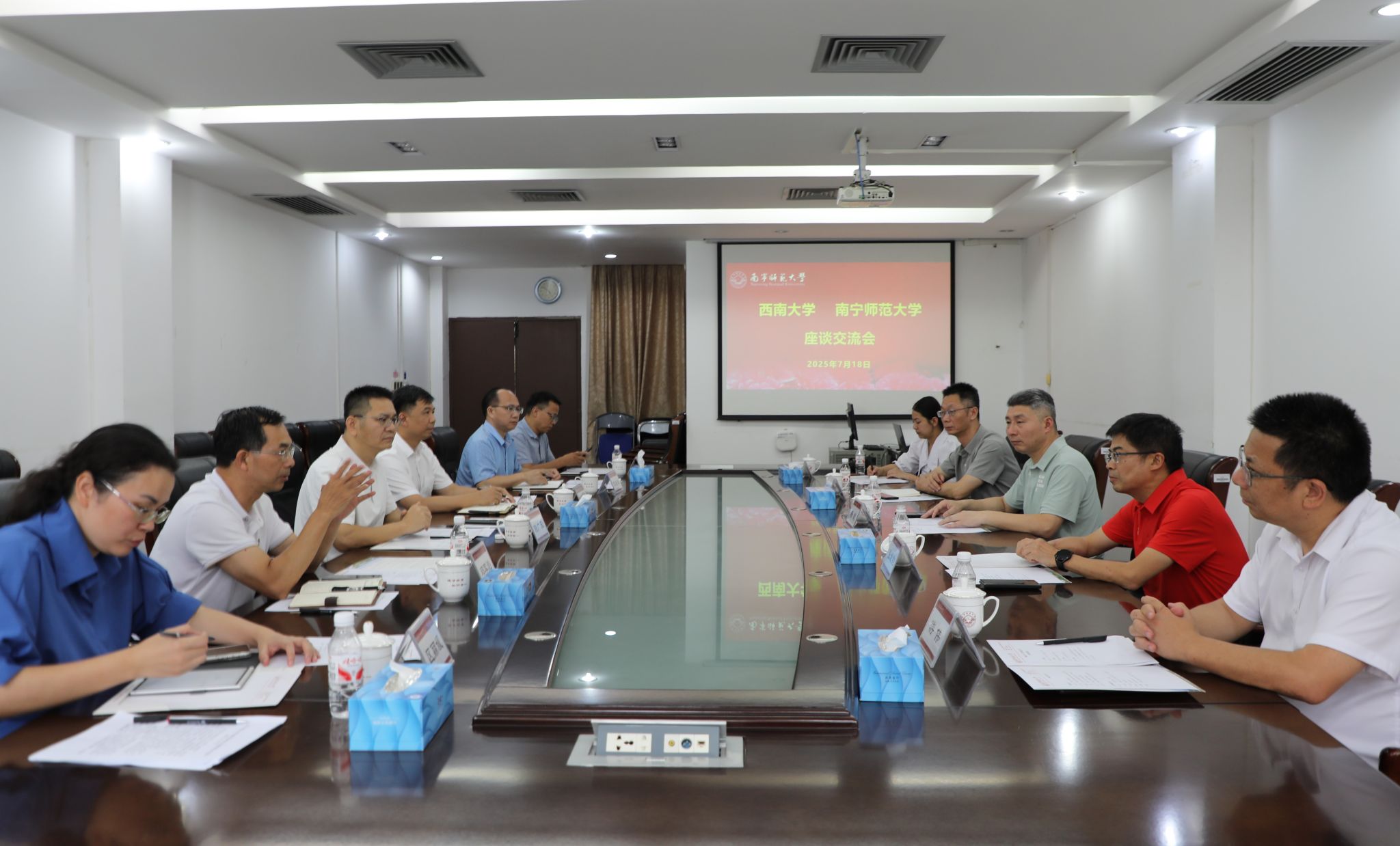 7月18日下午,西南大学副校长赵玉芳一行6人到我校开展调研交流。我校校长隆广庆热情接待了西南大学一行,并在会前与赵玉芳作了交流。我校党办校办、人事处、教务处、国内合作处、广西现代教育杂志社有限公司等部门负责人在明秀校区鸿远楼407会议室参加交流座谈会。会议由隆广庆主持。