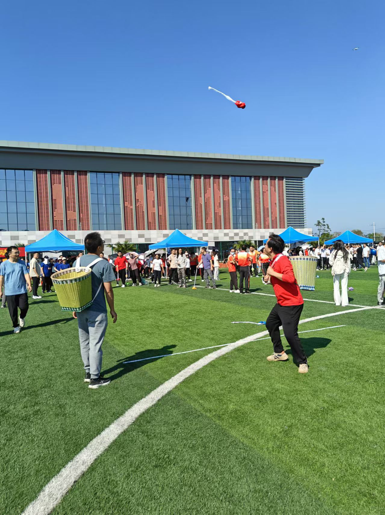 在本次举行的教职工趣味运动会中,抛绣球比赛无疑成为了一大亮点。这项比赛不仅考验着参与者的精准度,更对团队协作提出了极高的要求。比赛要求八人的队伍分为四组,一人背着背篓在接球区,每组投球手执5个绣球站在投球区内从起点投掷绣球。比赛以每队在两分钟内投进背篓的绣球多少决定名次,如投进的绣球数相同,则用时少的队伍名次列前。
