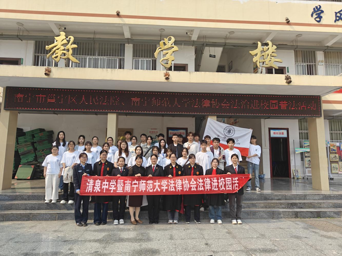 为深入落实"八五"普法规划要求,提升青少年法治实践能力,3月25日下午,南宁师范大学法律协会普法志愿团走进南宁市邕宁区清泉中学,通过"沉浸式体验+精准化普法"模式,为200余名中学生带来别开生面的法治教育课。本次活动由南宁师范大学法律系秦晓辉老师、杨剑锋老师指导,法律协会会长杨金燕带队。