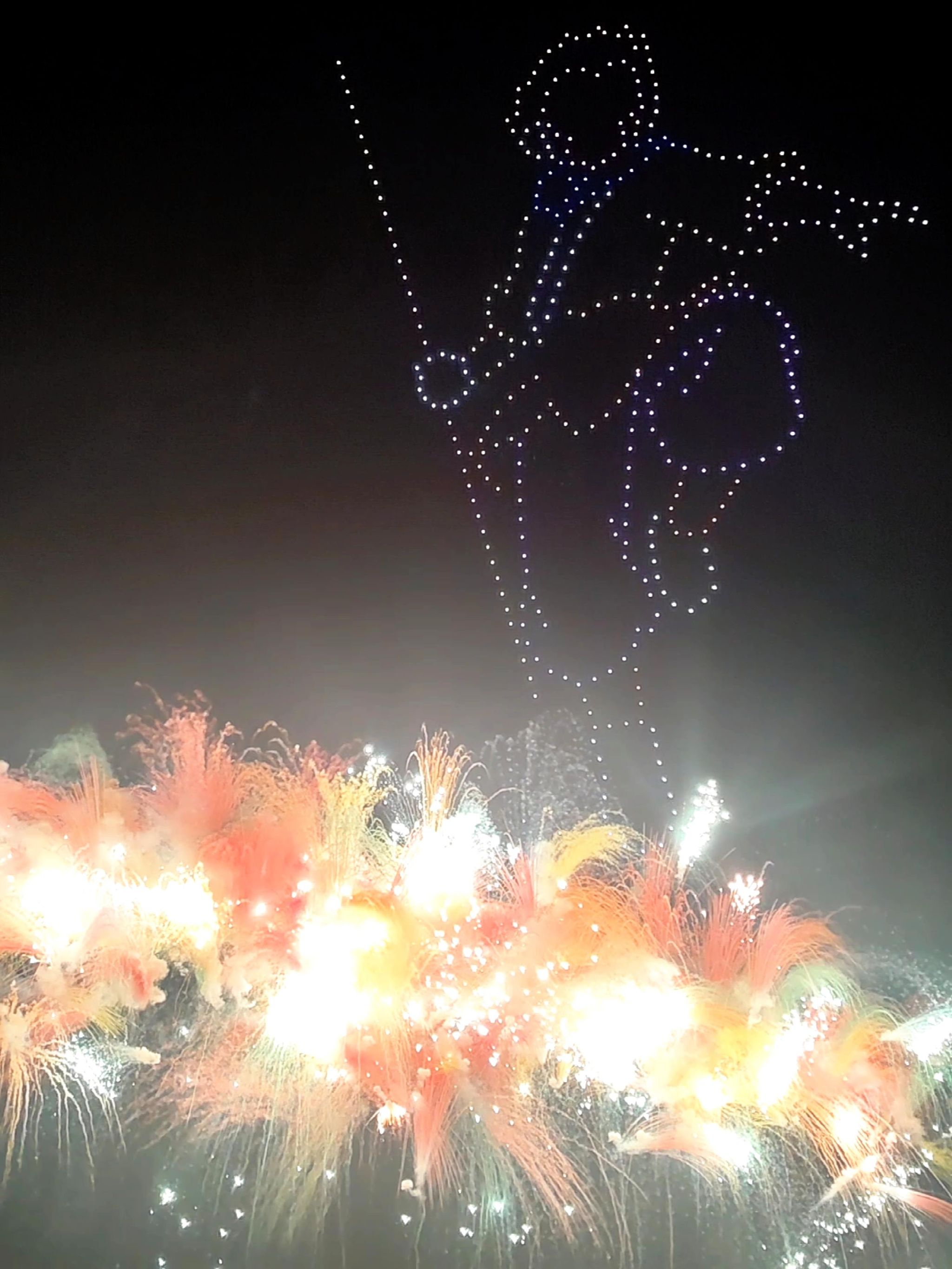 这幅画面中,无人机在空中组成特定造型,下方烟花绚烂多彩。这是融合了无人机表演与烟花秀的精彩时刻。五一期间,此类表演将科技元素与传统烟花结合,无人机在空中变幻造型,烟花在地面绚丽绽放,二者交相辉映,给同学们带来震撼的视听享受,展现了假期活动的创意与精彩。