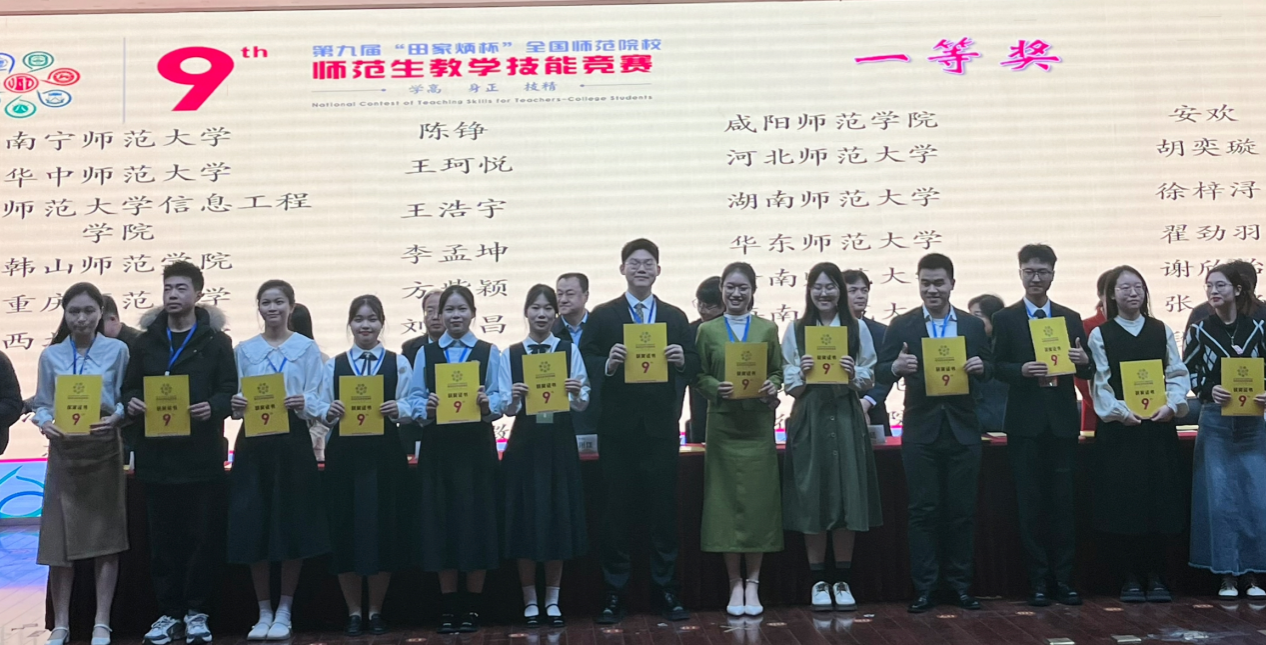 2023,佳音频传,喜报连连!2023的最后一天,第九届"田家炳杯"全国师范院校师范生教学技能竞赛落下帷幕。总计226 所学校1611 名选手参加比赛,分为11个组别。其中,汉语言文学专业决出一等奖16名。决赛采取随机抽取课文进行模拟上课的形式,选手需要在紧张的120分钟内完成一课时的教学设计和ppt课件的制作,同时,也需要在5分钟内整理演讲思路,进行即兴演讲。我院陈铮同学从四月开始训练,在指导老师黄铮、黄斌和王毅老师的精心指导下,对五册高中语文教材共400余篇课文进行了赛课的磨课准备,奋发向上,勇往直前,最终荣获田家炳杯"全国师范院校师范生教学技能竞赛一等奖的好成绩!