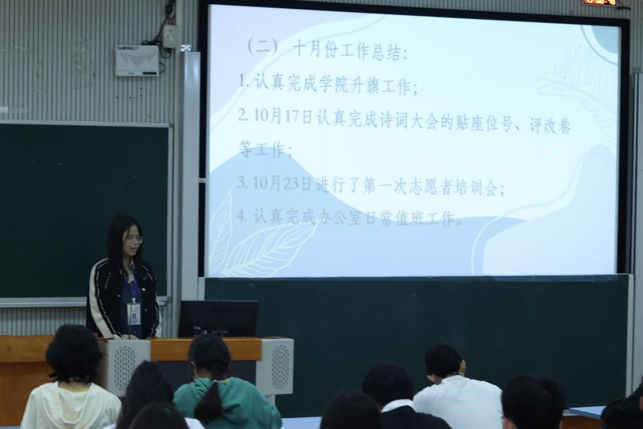 会议开始,各部门负责人依次上台作2023-2024秋季学期工作总结,分享自己的收获与成长。接着,团委学生会主席团成员就本学期工作进行简单述职。会议最后由苏惠敏老师为本学期表现优异的十位同学进行颁奖。同时她也肯定了团委学生会全体同学付出的努力,希望2024年大家能携手共进,把团委学生会建设得越来越好。