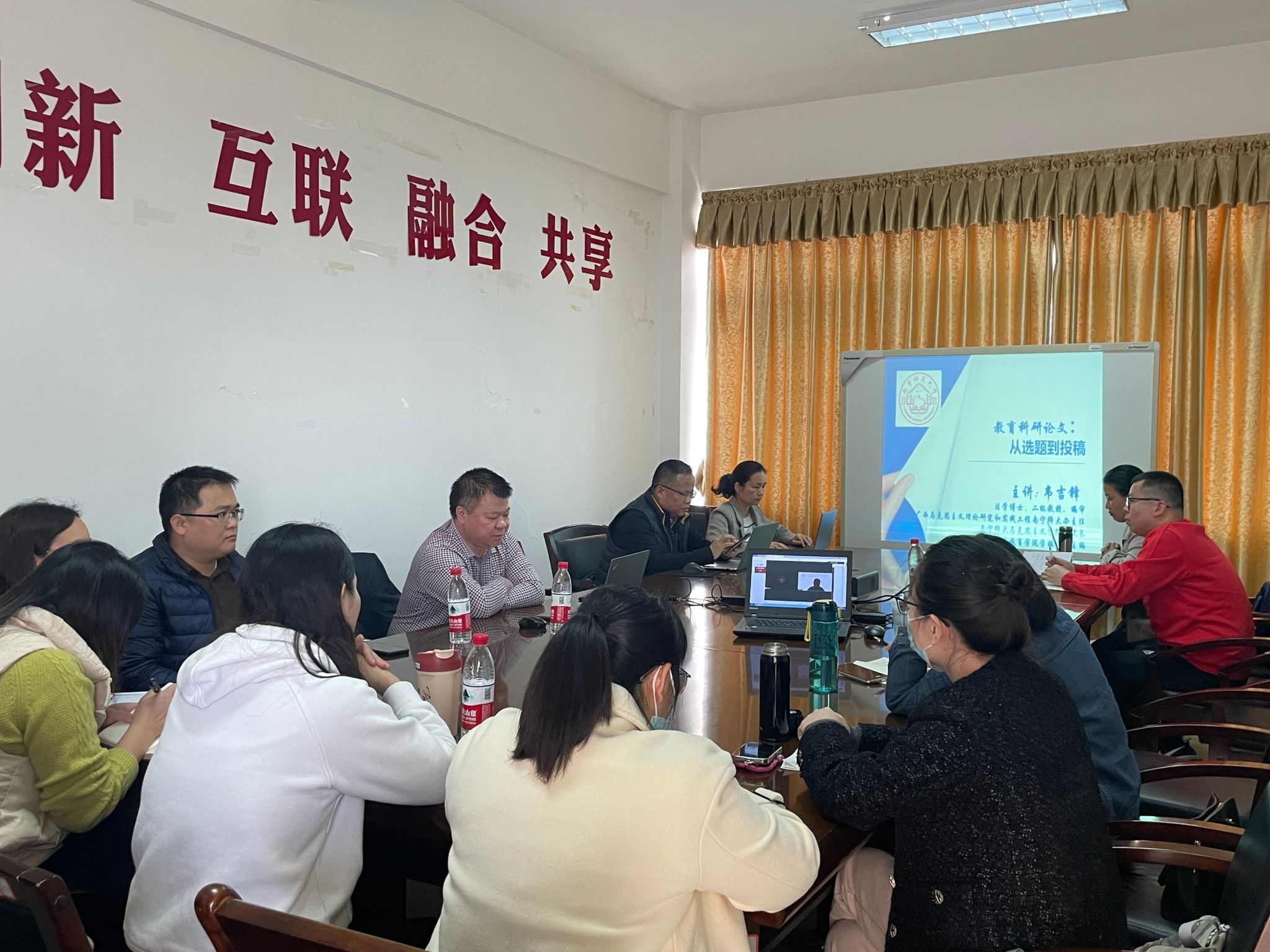 韦吉锋教授从教学科研文章的选题、资料收集、写作和投稿等关键方面进行指导。他从“为什么要撰写教育科研论文”入手,向青年教师阐明教育科研论文的重要性,强调教育科研论文是教育科研成果的总结、记录和表达,教育科研成果也需要通过论文的撰写与发表进行推广交流,彰显了教育研究对教育工作者素质提升及教育事业发展的重要意义。韦吉锋教授阐述了教育科研论文的特点及选题要领,介绍了教育科研资料收集整理的途径和经验,建议青年教师可以从工作、调查、阅读、学术会议、数据库等途径,有意识有方向地收集研究资料,重点探讨了教育科研论文的写作与投稿,分享了文章规范写作、修改和投稿的经验。