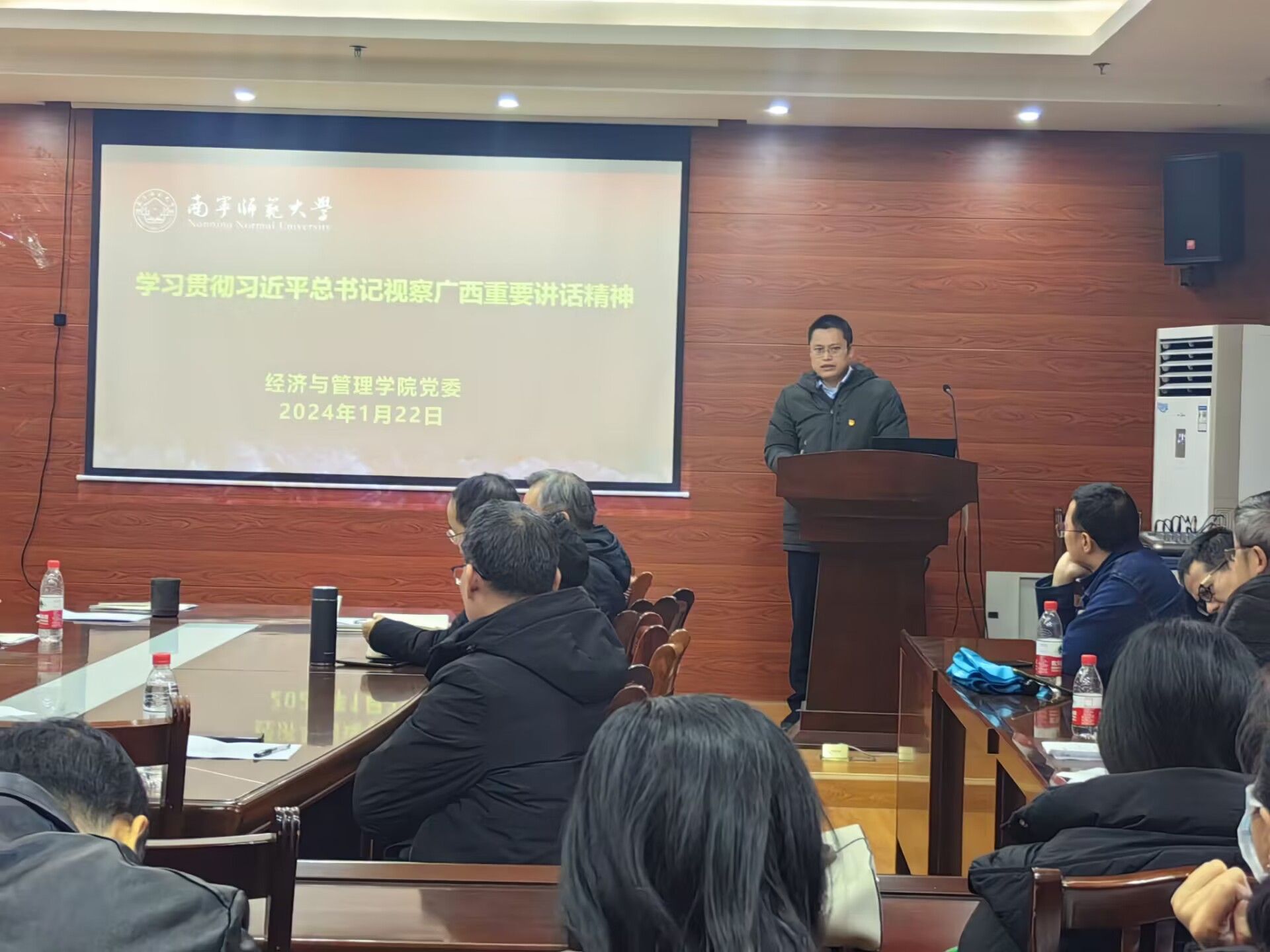 为深入学习贯彻习近平总书记视察广西重要讲话精神,2024年1月22日上午,经济与管理学院在五合校区理综楼515会议室组织专题学习贯彻习近平总书记视察广西重要讲话精神。会议由党委书记纪明主持,全体教职工参加学习。