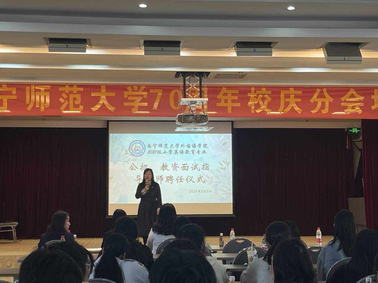 为增强毕业生就业积极性和主动性,有针对性的指导我院毕业生就业,提高毕业生就业竞争力,2024年3月5日下午,外国语学院举行2024届小学英语教育专业毕业生公招、教资面试指导老师聘任仪式。外国语学院高飞雁副院长、南宁市华衡小学宁罕校长、南宁市华衡小学科研主任韦静老师、外国语学院辅导员兼毕业班班主任邓梦芸老师、以及2021级普专全体在校师生参加本次活动,仪式由辅导员主持。