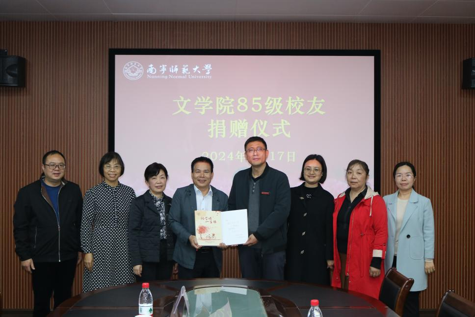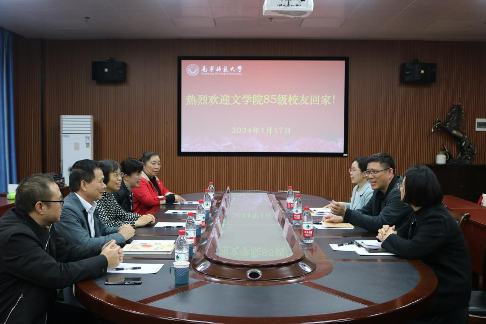 2024年1月17日,文学院85级校友代表闭健云、钟文、周敏一行回母校参观座谈。学校纪委书记李美清(文学院85级校友),校友办副主任韦天翼(文学院98级校友)及学院领导班子出席座谈会。
