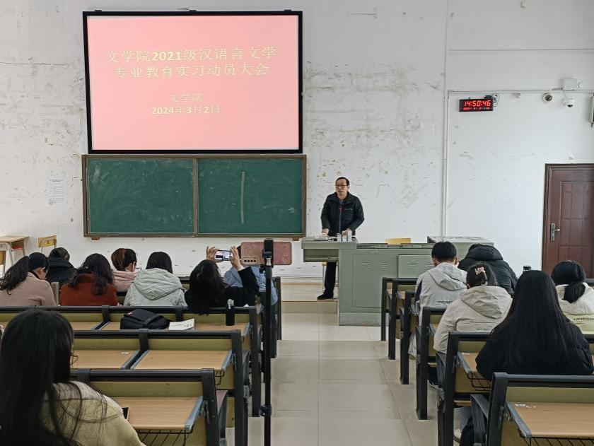为推进师范生教育实习工作的有序开展,增强师范生的教学综合实践能力,文学院于3月2日下午在五综308教室召开了2021级汉语言文学专业教育实习动员大会。本次会议由张煊光老师主持,文学院院长石勇、党委副书记李树玲、全体实习带队老师以及2020级汉语言文学专业全体本科生参加了会议。