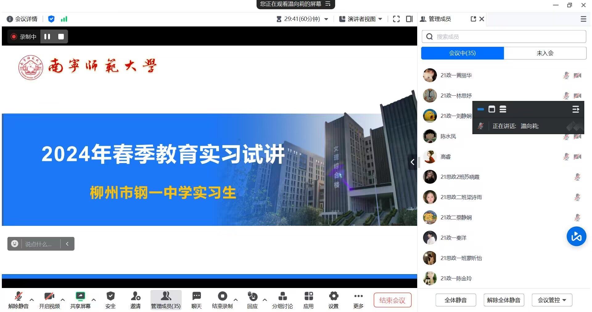 寒假期间,2021级全体同学开展了线上试讲,校内实习指导老师线上点评,同时也邀请了2020级同学为2021级同学传授实习经验、热心答疑解惑,从教材解读、课件制作、授课状态以及各实习学校的相关情况等进行了细致介绍。