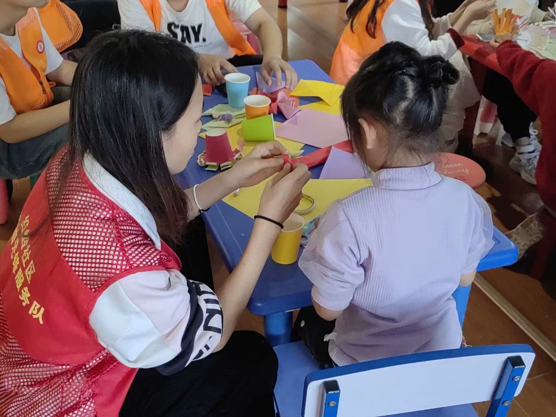活动中,志愿者热情友善地与小朋友交流互动,现场教授小朋友们手工制作,通过制作扭扭棒和折纸等手工作品向小朋友传递快乐和知识。在志愿者的带领下,社区的小朋友踊跃参与,活动现场热闹非凡,笑声不断。在轻松愉快的氛围下,小朋友发挥他们的创造力和想象力,大胆尝试,同时主动与志愿者们分享自己的成果。活动的最后,志愿者和小朋友一一道别并赠与小朋友每人一支铅笔作为其积极参与活动的奖励,小朋友脸上都洋溢着幸福的笑容。