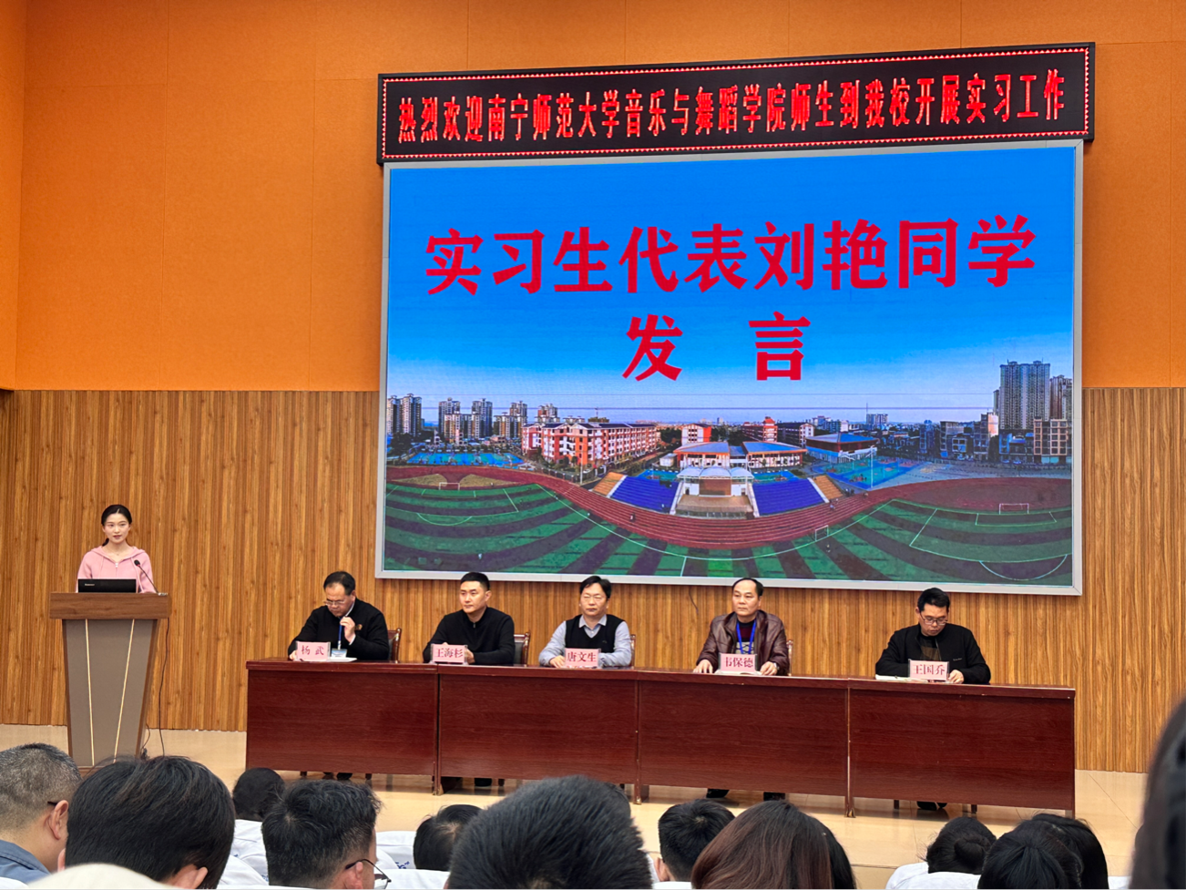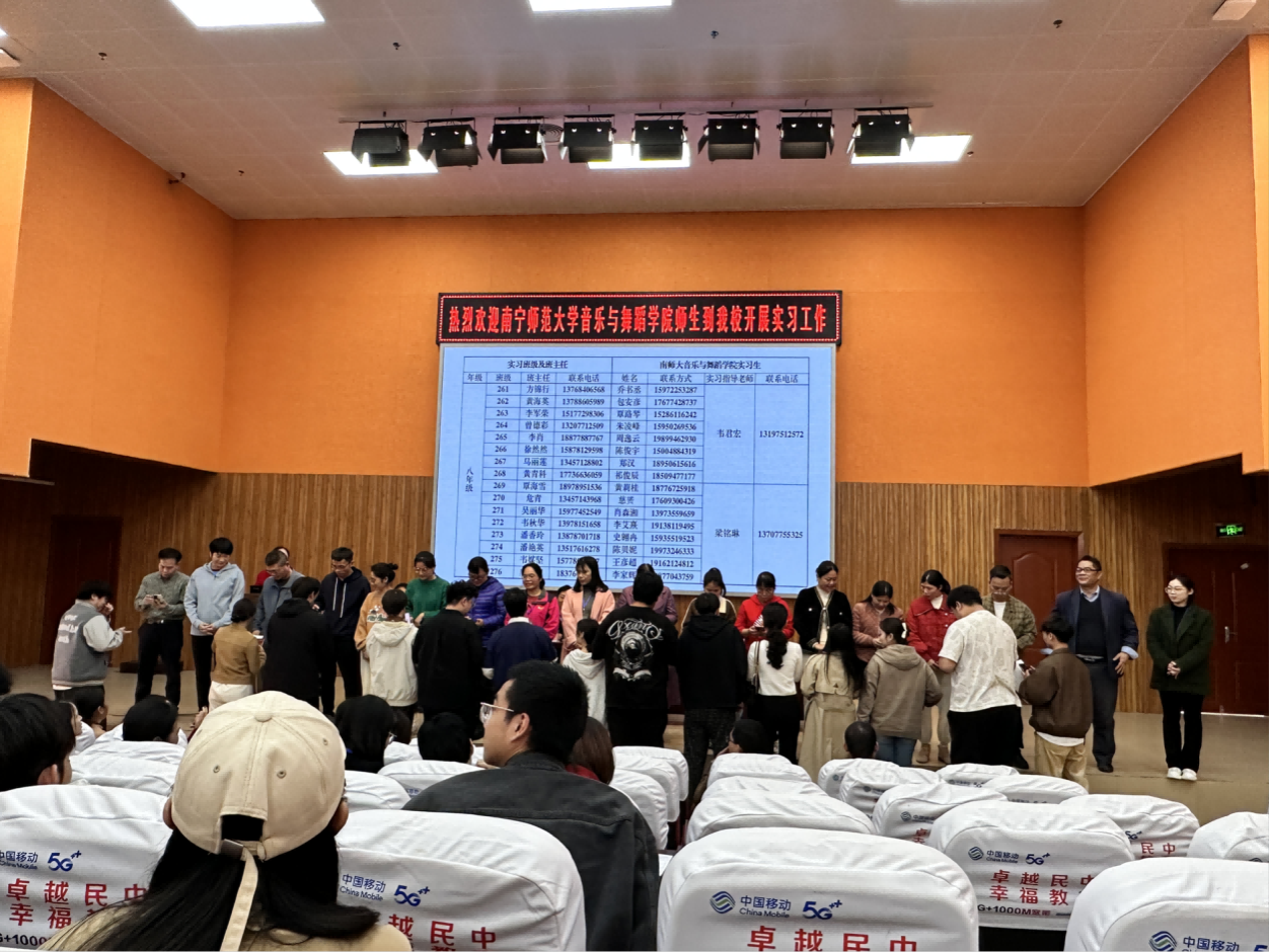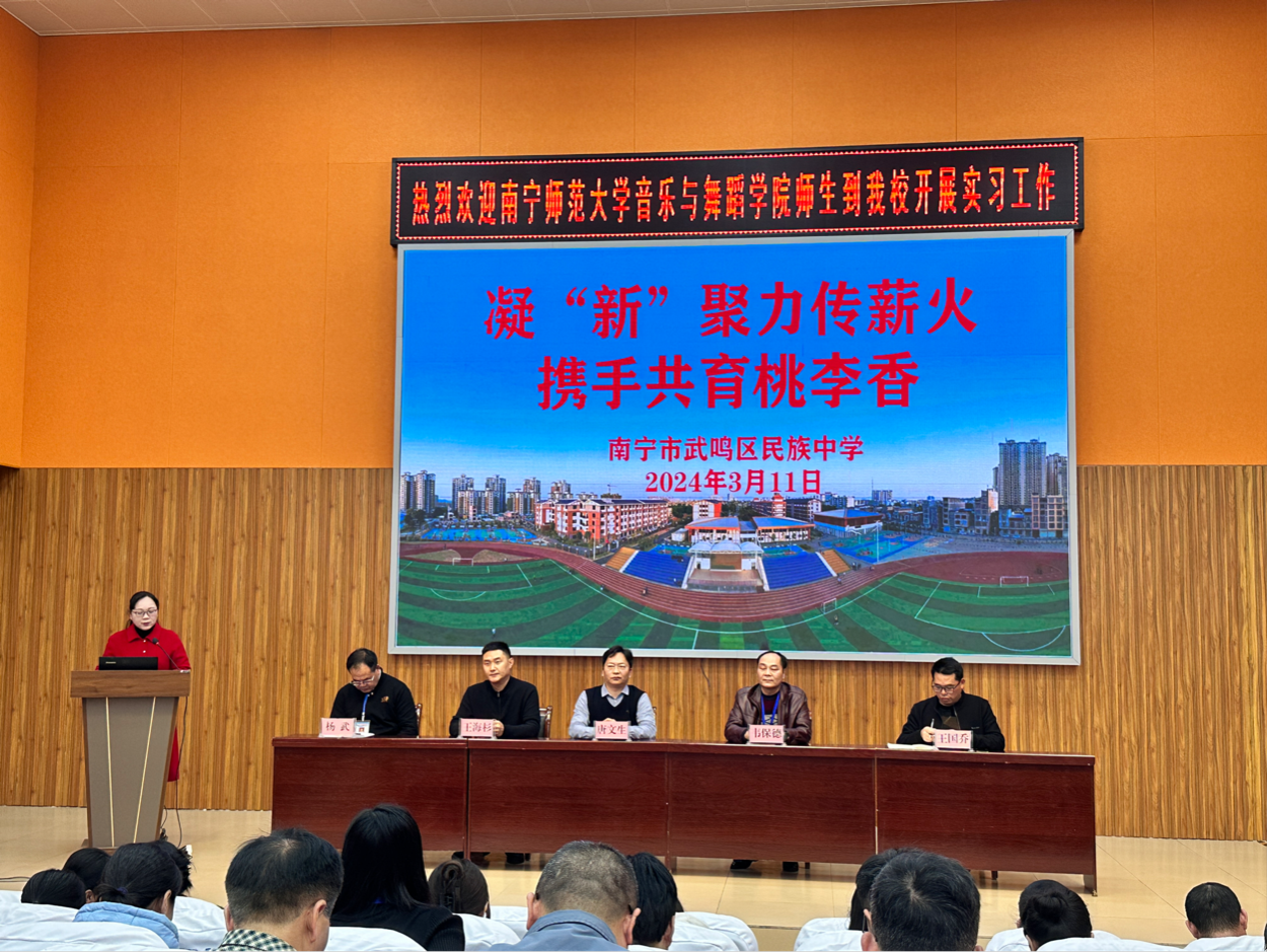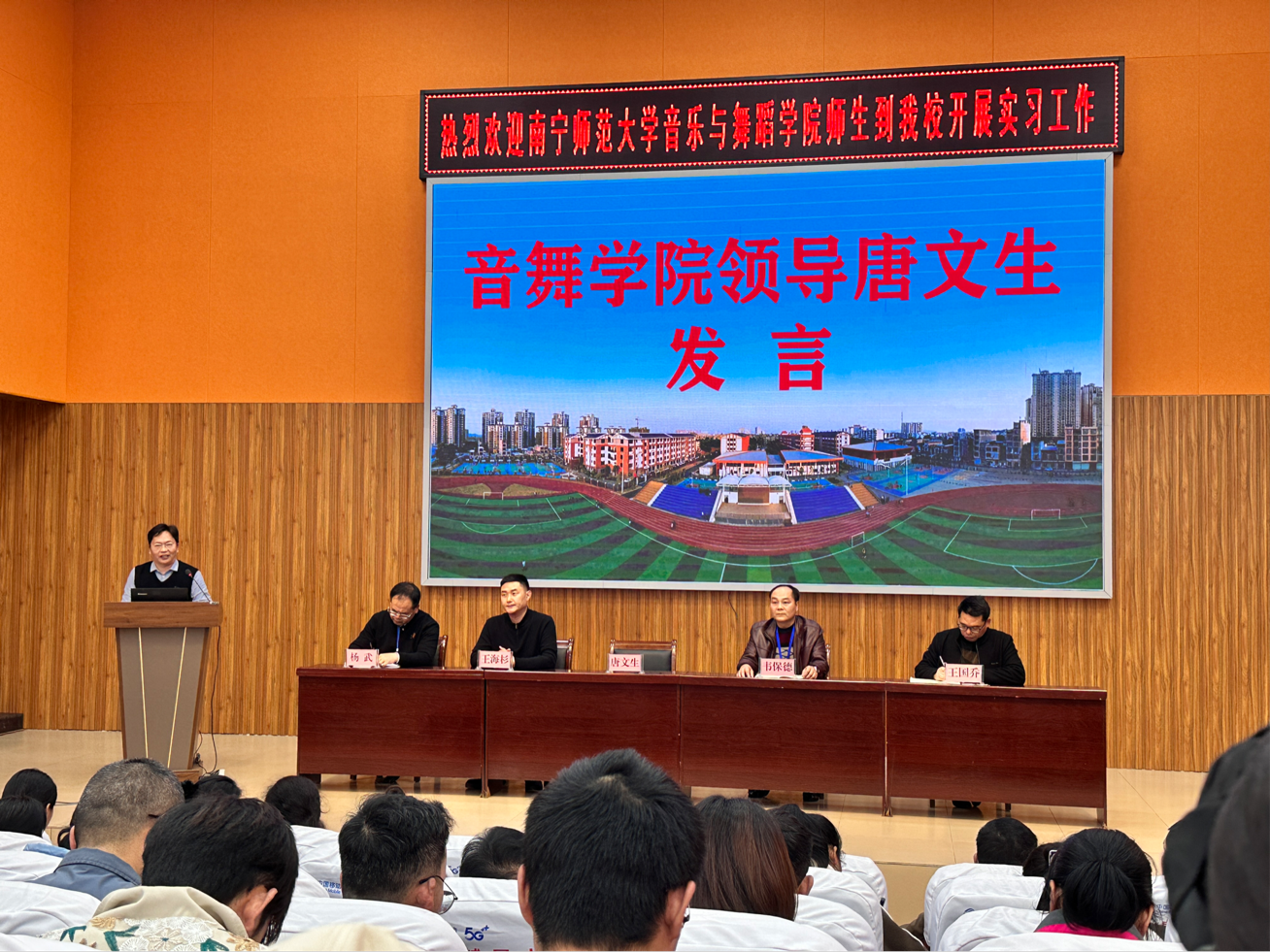 2024年3月11日下午,音乐与舞蹈学院院长助理唐文生、教研部主任王海杉带领2020级音乐学专业学生赴武鸣区民族中学进行教育实习,实习见面会在武鸣区民族中学报告厅举行。
