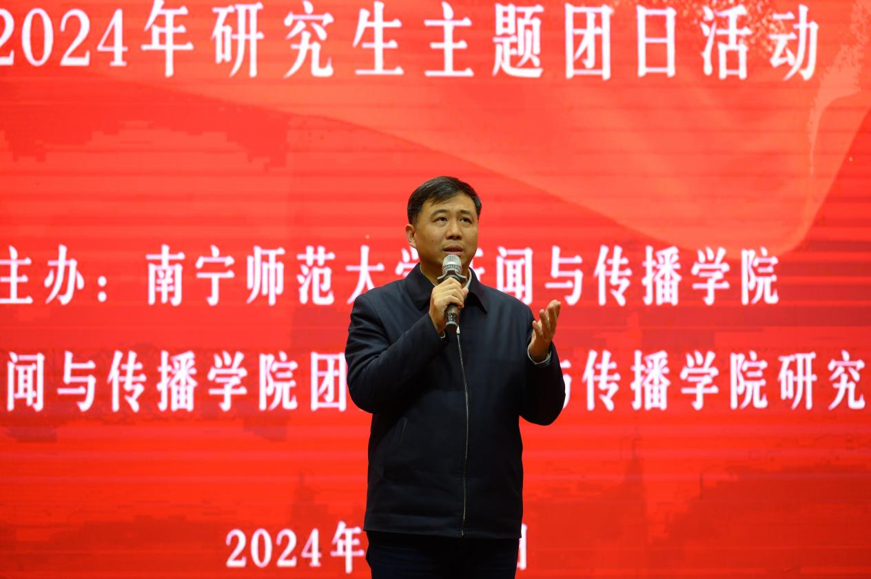 活动在团歌中拉开帷幕。学院党委副书记、院长陈洪波致辞,他首先代表学院党委行政向此次活动的成功举办付出辛勤汗水的师生们表示衷心感谢。陈洪波院长谈到,新闻与传播学院在2023年迎来了三件大事:一是迎来校友“归家”共庆学校70周年校庆,加强了学院与校友之间的联系;二是成功通过了2023年学位授权点专项核验检查;三是全面启动教学改革,“高质量发展 品牌八桂行”联合采访活动顺利开展,“广西品牌与文化传播研究中心”和“南宁师大一带一路与文明互鉴中心”两大科研平台建立,研究生人才培养的创新工程全面启动,研究生的成长环境、培养机制正在持续优化,学院发展欣欣向荣。最后,他为全院师生送上了新学期的祝福。
