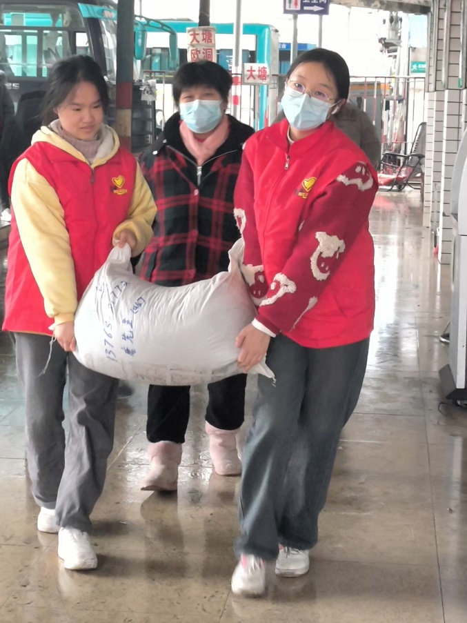 在活动现场,2021级专升本4班林桂兰和2023级计本班韦翔、傅晨希同学身着统一的志愿者服装,脸上洋溢着青春、阳光的笑容,活跃在车站的各个角落。他们利用自己的知识储备和技能,耐心、热情地为归途的旅客提供信息咨询、票务协助、行李搬运、应急救援、交通安全劝导、出行建议等帮助,用实际行动践行了“人民至上”“助人为乐”的理念,展现了新时代青年的责任与担当,也让返乡的旅客旅途充满温馨。