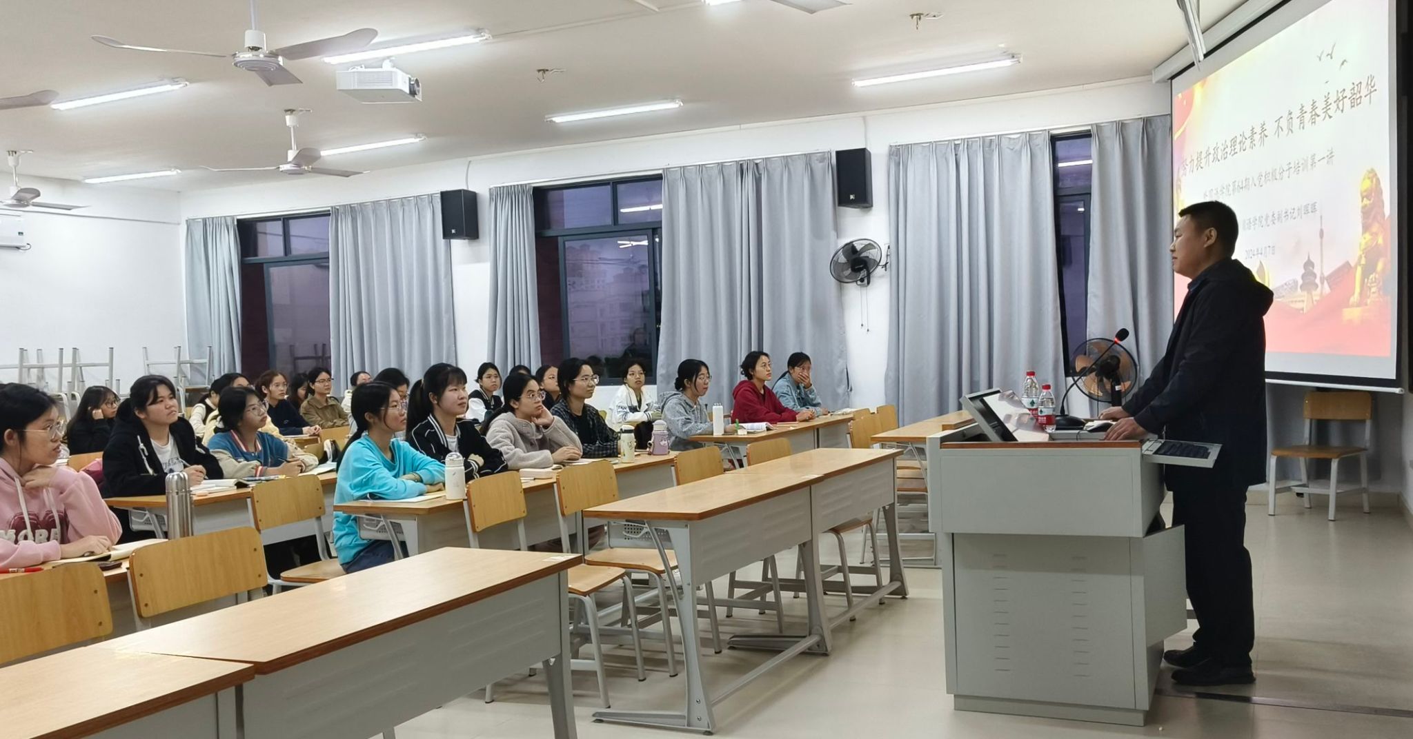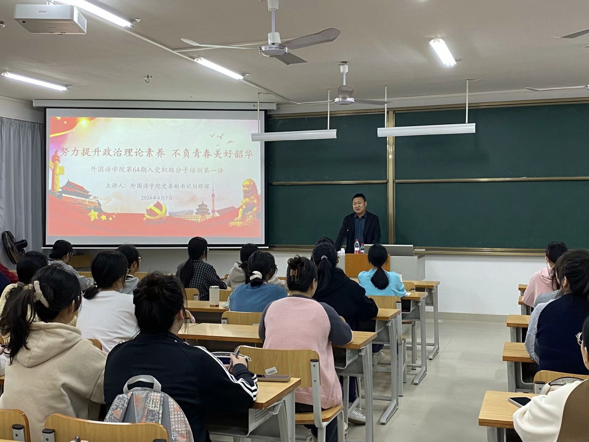 4月7日,外国语学院党委在实验楼举办第64期入党积极分子培训会第一讲。本次培训会主题为“努力提升政治理论素养,不负青春美好韶华”,由外国语学院党委副书记刘晖晖主讲,本学期认定的47名入党积极分子参加了此次培训。