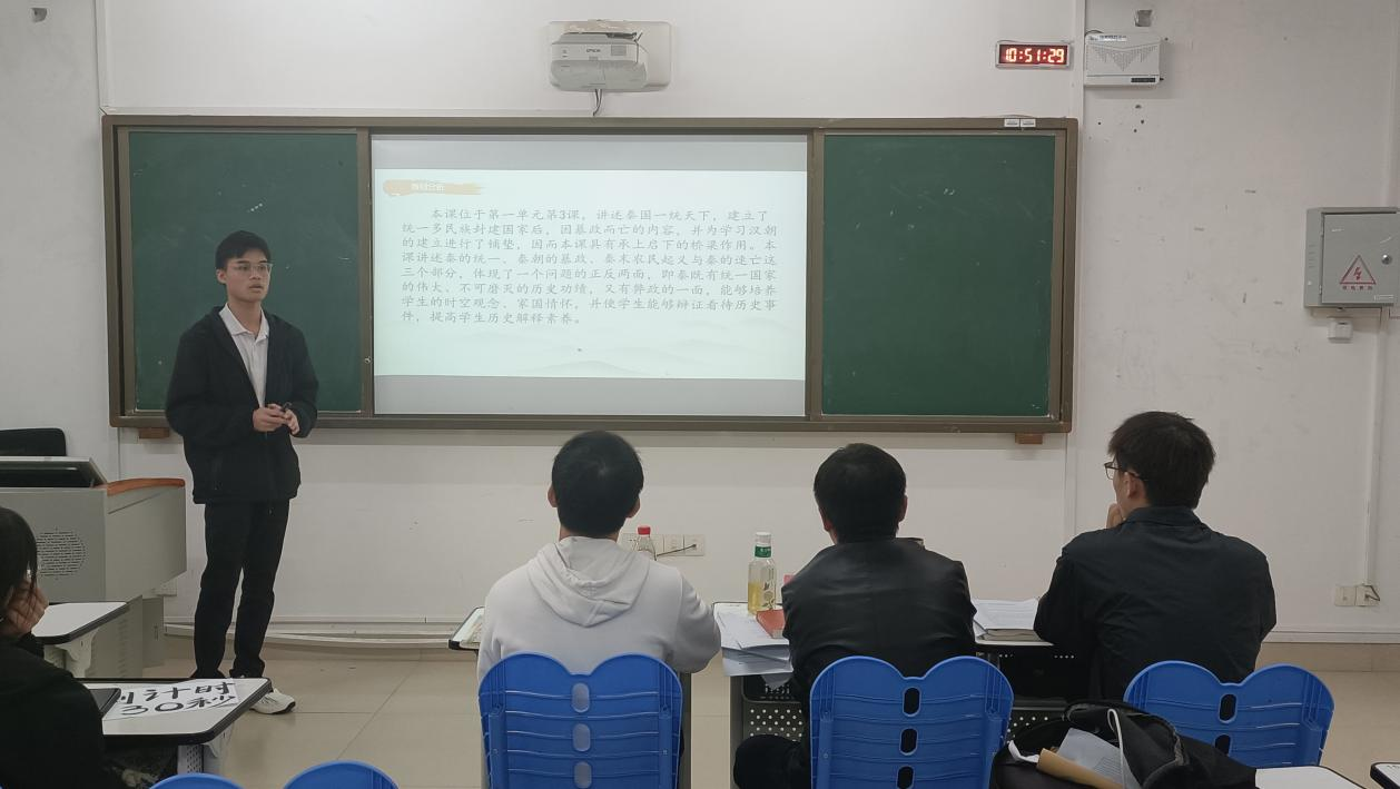 在活动前期,工作人员将活动方案、报名表等文件发布至班群,让同学们更好地了解具体比赛内容。同学们跃跃欲试,共有85名同学报名参赛,体现了学院学子对参与本次大赛的热情与期待。活动当天,工作人员早早前往活动现场布置,参赛选手在完成签到后,听从指挥有序进场。比赛过程中,参赛者们以良好的精神面貌站在讲台上,根据自己的备课和PPT内容展开自己的说课、试讲。每位选手都做足了准备,讲课内容精炼,突出重点,课程结构设置得也十分紧凑有条理,展示了过硬的教学技能与素养。本次比赛还邀请了学院的刘方富、岳树燕、杨东东等七位教师和宋思佳等12名研究生担任评委。比赛过后,工作人员收集并整理好评分表,以公正严谨的态度对每位选手的成绩进行整理统分。最后21历史一班罗楚雄,21历史二班钟兴、谢海清同学荣获特等奖,21级历史一班卢贝蓓、潘秋月,21历史二班梁乐怡,22历史一班周子烨、苏艳艳、黎芸同学荣获一等奖,21历史一班蔡雨彤,21历史二班黄雅甜、刘棋、李郡,22历史一班李艳丰、包雄军同学荣获二等奖。