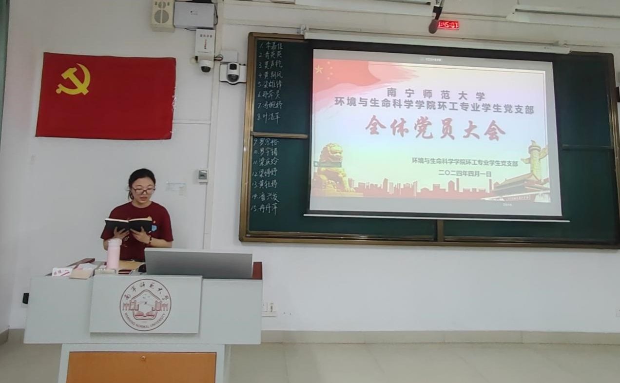 为加强基层党组织建设,切实提高党员发展质量,落实学院发展党员工作计划,推进支部党员队伍发展,4月1日晚上,环境与生命科学学院环工专业学生党支部在武鸣校区1号教学楼219教室以线上线下相结合的方式召开全体党员大会。参会人员有环境与生命科学学院环工专业党支部书记曲炳鹏及环境与生命科学学院环工专业学生党支部全体党员。