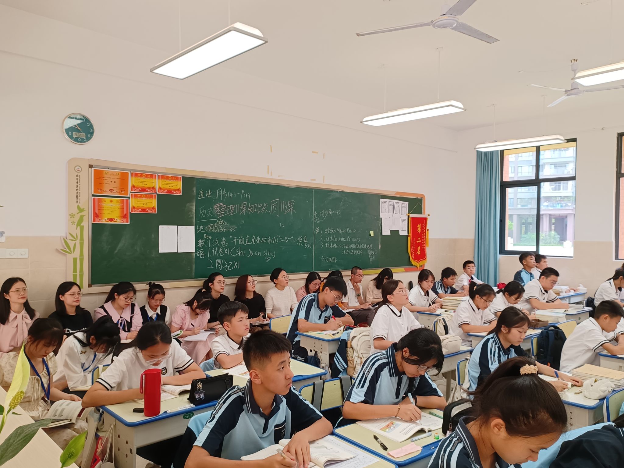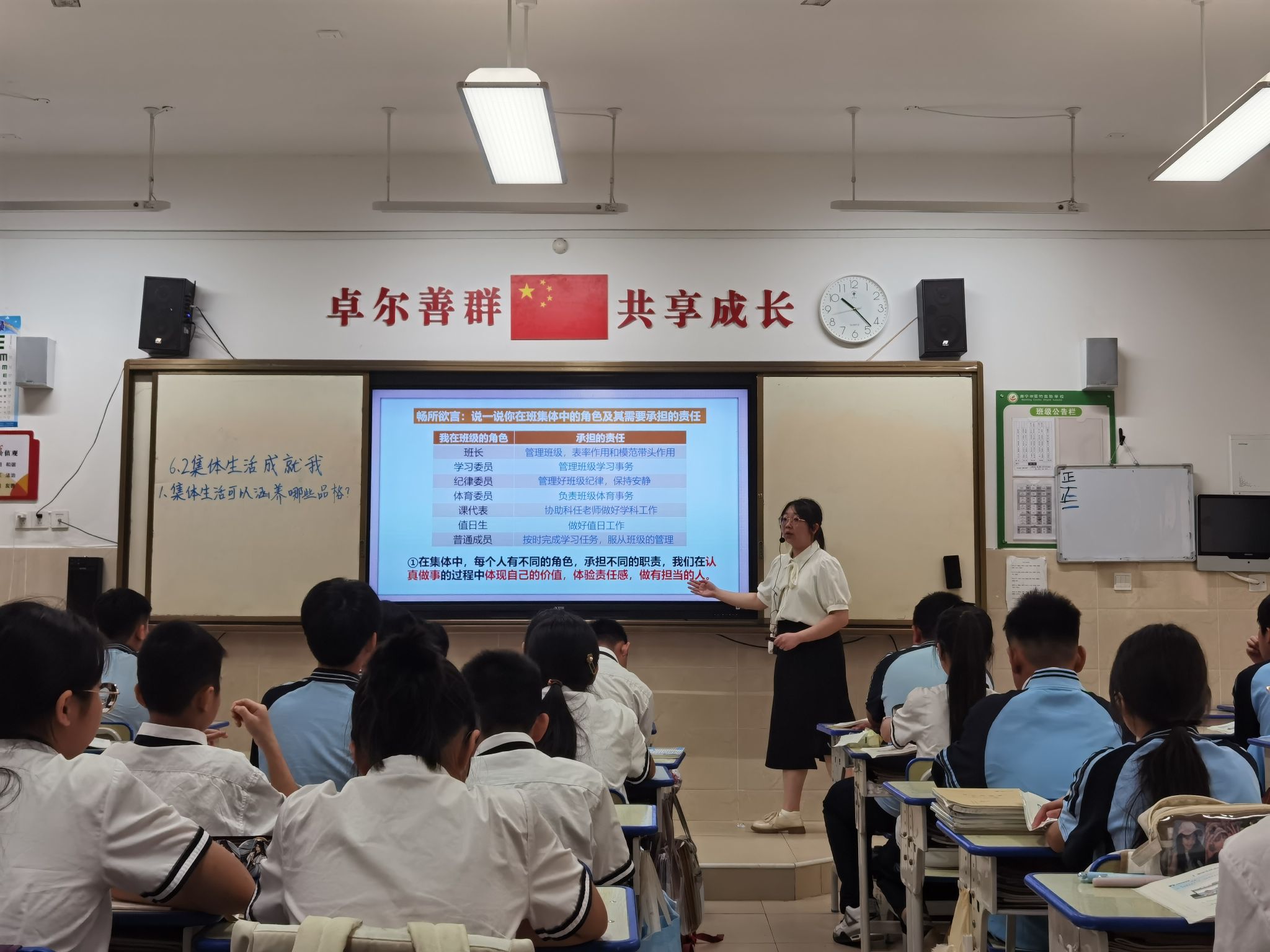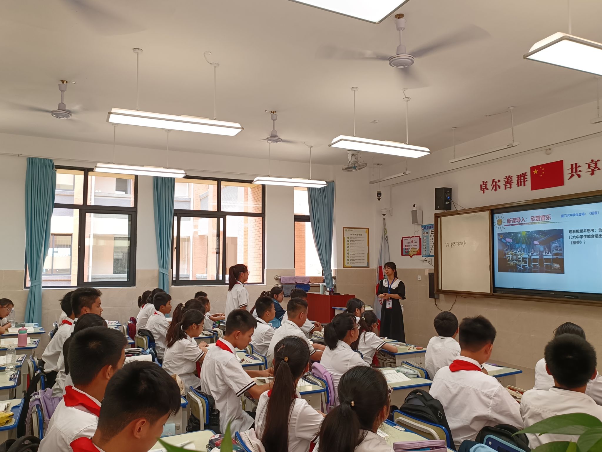 随后,原理党小组的党员教师们来到七(6)班和七(1)班课堂,现场听了实习生谢璐遥的“集体生活成就我”和实习生韦丽芳的“单音与和声”两节课教学,授课教师讲解生动透彻,展现出过硬的教学基本功和扎实的专业素养,课堂上,学生回答问题积极,思维开阔,课堂气氛活跃。课后,两位授课实习生结合自己在本次课教学中存在的问题进行教学反思。