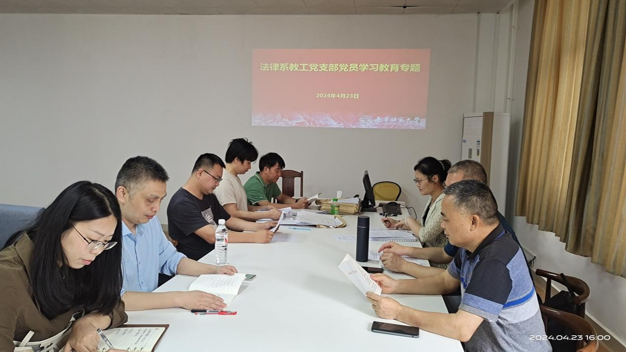 根据学院党委工作部署安排,4月23日下午,法学与社会学院法律系教工党支部在五合校区理楼602室开展了党纪学习教育专题学习会,深入学习新修订的《中国共产党纪律处分条例》。法律系教工党支部全体党员参会。