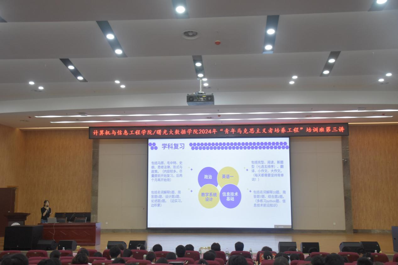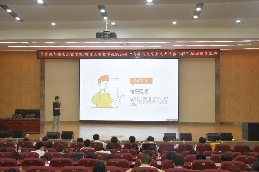 计算机与信息工程学院/曙光大数据学院4月19日在图书馆报告厅举行“青年马克思主义者培养工程”(以下简称“青马班”)培训班第三讲——2024年考研求职经验分享会。此次会议邀请了多位优秀学长学姐作为嘉宾分享经验,学院兼职辅导员石凯、团委学生会主席团、我院“青马班”全体学员以及三百多位同学参加。