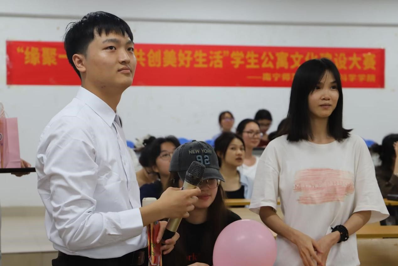 主持人向同学们介绍了比赛形式、比赛规则。1号宿舍在介绍本宿舍成员后通过情景剧形式向大家展示广西各地特色文化,表达出“即使宿舍每个人来自不同地区,但相聚就是一家人”的宿舍理念;2号宿舍通过情景剧形式演绎日常生活可能会出现的矛盾情景,体现出“每个人都要相互尊重才能和谐共处”的宿舍理念等等,在宿舍展示环节,各宿舍通过不同形式来展现各宿舍特色、宿舍公约、宿舍文化等……