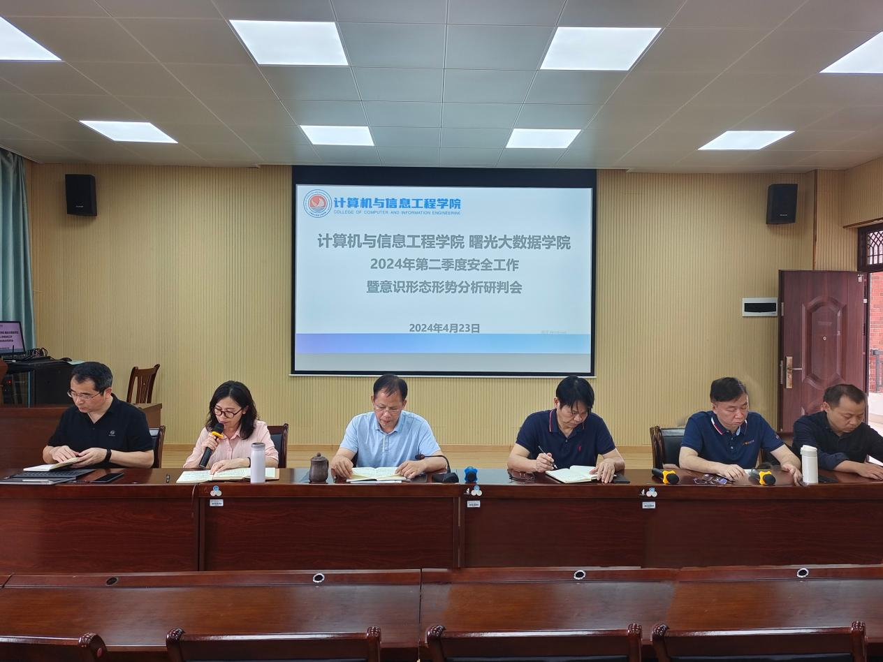 4月23日,计算机与信息工程学院/曙光大数据学院在地信楼A301教室召开2024年第二季度安全工作暨意识形态分析研判会,学院领导班子和全体教职工参会。会议由学院党委书记余朝文主持。