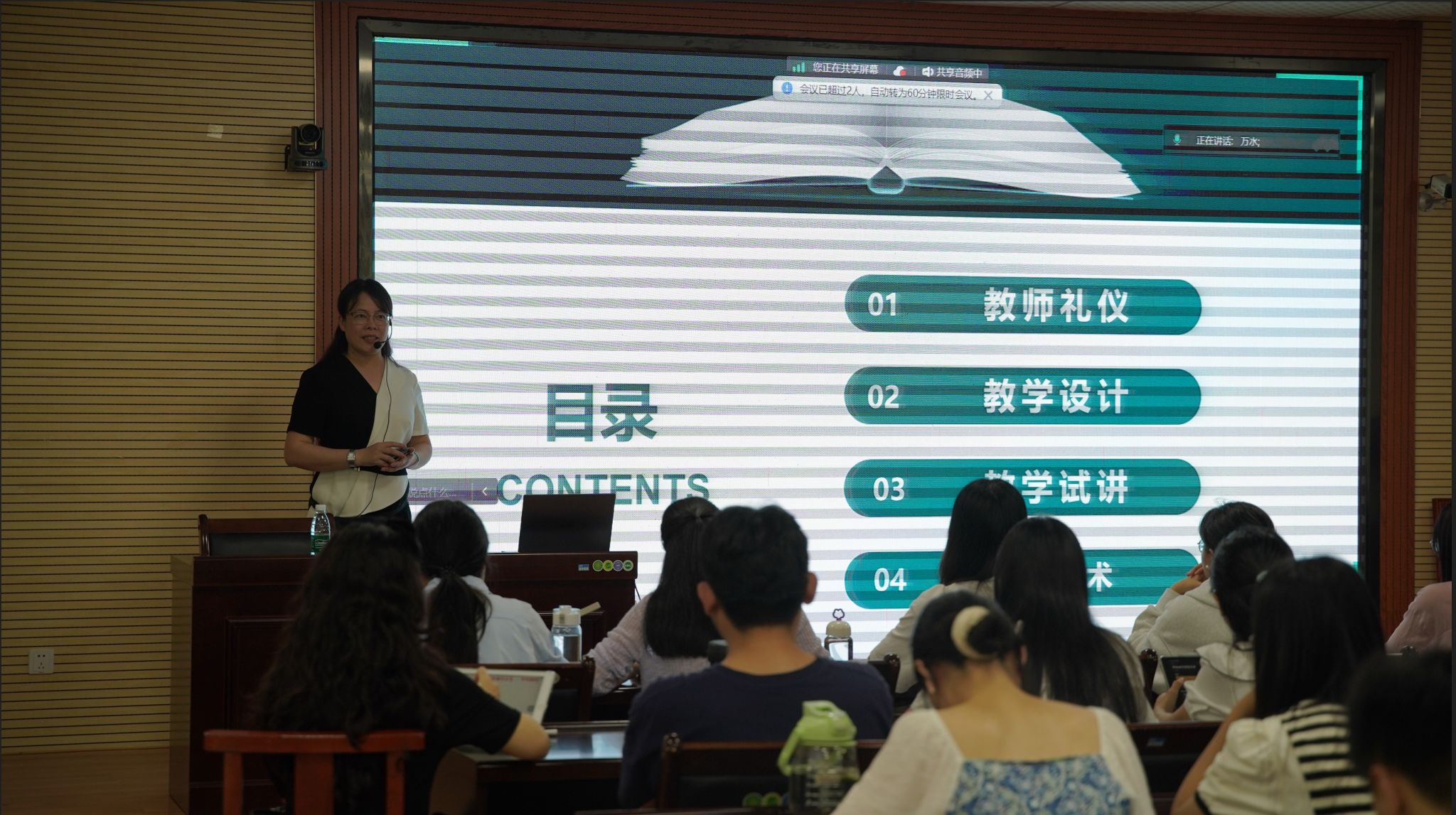温老师围绕教学设计是否有固定的模板这个问题,对同学们做出了回应。她指出,教学设计没有固定的模板,但应包括一些主要内容,要有教学基本信息、教材分析、学情分析、教法和学法分析、教学过程分析、板书设计,并向同学们展示了一份教学设计范例。针对教学目标的表述,温老师介绍了教学目标的分类,并向同学们展示了教学目标的表述范例。温老师还从五个方面重点讲述关于教学试讲的内容:一是片段化教学,强调要选取教学重点、难点,要讲深讲透讲活;二是教学环节要完整,包括教学导入、突出重难点、突破教学难点、教学小结;三是教学要贴近学生,针对普通教育,教学要贴近实际、贴近生活、贴近学生,针对职业教育,教学要贴近学生、贴近职业、贴近社会;四是充满激情、亲和力,指出了语音、语调、微表情的重要性;五是吃透教材、处理好教学内容,温老师通过一个高职高专的精彩示范课范例、一个说课范例,向同学们展示出吃透教材的处理办法,为同学们提供了借鉴。