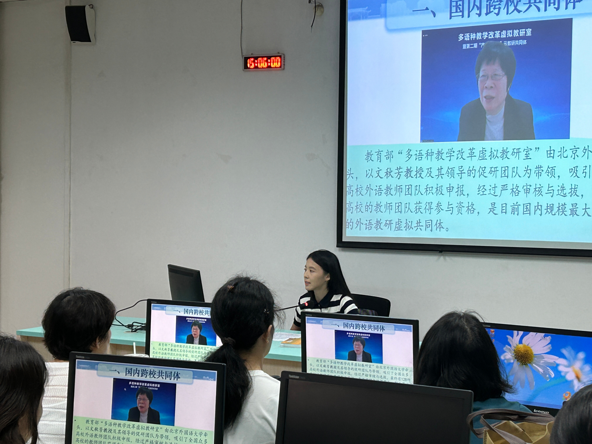 5月7日下午,在外国语学院的教研室集体研讨中,钟荛键老师代表校本团队分享了参与国内最大规模外语虚拟教研室的学习收获与成长经历。