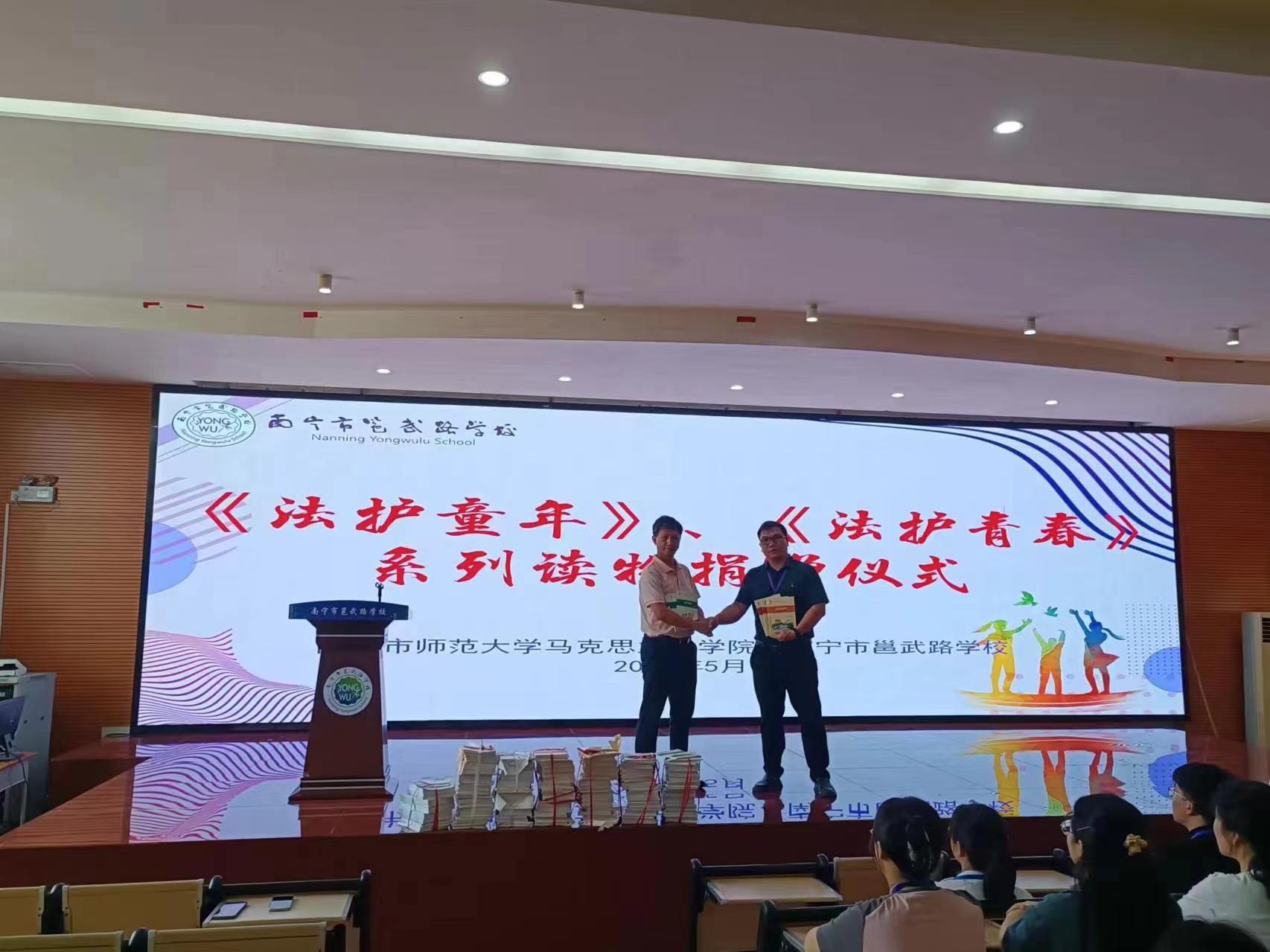 会上,双方举行捐书仪式,由南宁师范大学马克思主义学院向邕武路学校捐赠《法护青春(上下册)》150套、《法护童年(上中下册)》150套和《遇事用法:身边法治案例》100册,三套书共400套(册)双方就共建义务教育学段思政课一体化建设实验学校暨中小学法治教育一体化国家级教学成果推广进行了深入的研讨和交流,还就南宁师范大学研究生、本科生到邕武路学校开展教学见习和实习的长效机制进行了探讨,对本次前来见习、实习的学生作了统一的安排,并举行了见习(实习)启动仪式。南宁师范大学马克思主义学院教师代表向学院学生提出见习期间的主要任务和注意事项,并强调要注意安全,脚踏实地、勤学好问,认真完成各项见习和实习工作。沈校长希望各位见习实习学生能学有所获,不断提升专业技能,争做新时代“四有”好老师。