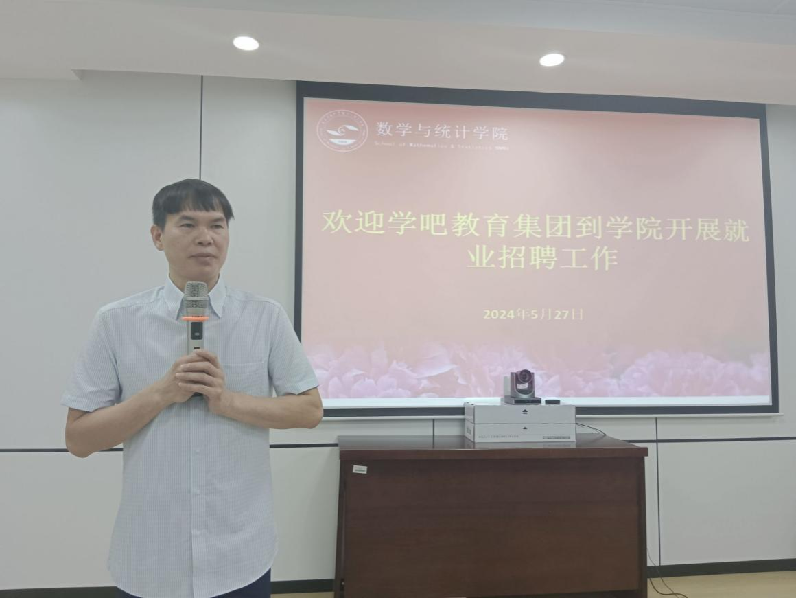 为进一步推进数学与统计学院学生就业工作,搭建企业和学生面对面交流平台,5月27日,数学与统计学院邀请学吧集团到学院开展就业招聘工作。本次招聘活动由我校2001级校友、学吧集团总经理覃龙韬带队到学院开展,数学与统计学院党委余敢才书记、党委付进副书记到场指导,本专科毕业生共计60余人参与本次招聘活动。活动由辅导员梁卡霖老师主持。
