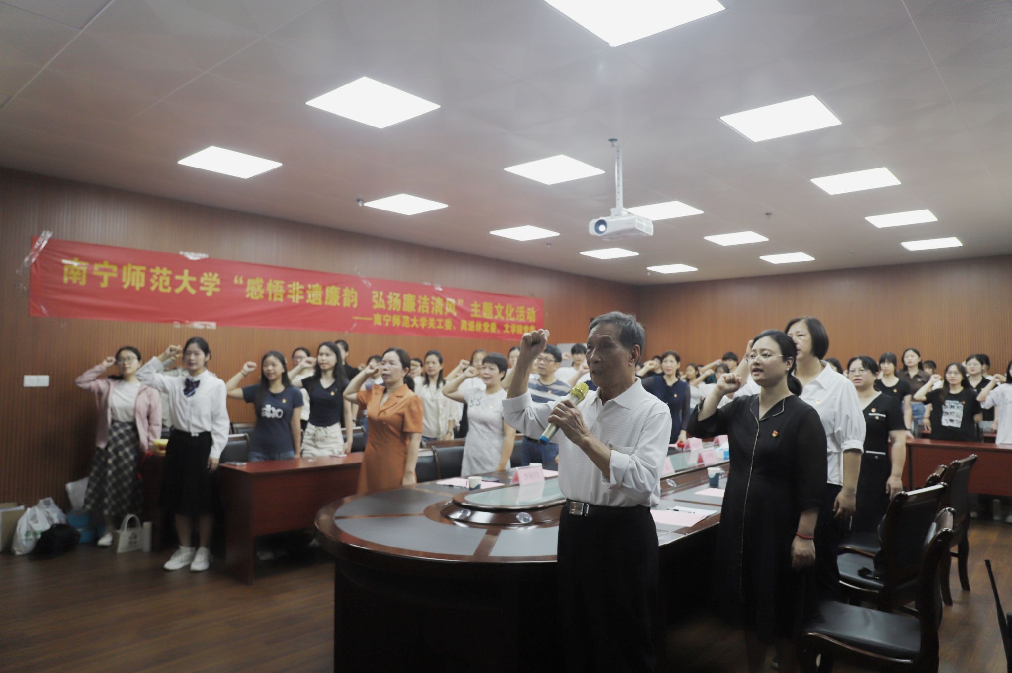 活动伊始,全体师生党员进行党纪学习教育,共同观看警示教育视频,齐声朗诵《爱莲说》,一起感受莲花出淤泥而不染、洁身自爱的高尚品格。随后,开展了“同庆政治生日”活动。文学院党委书记旷晓霞、离退休党委书记周泉向3名离退休老党员和6月入党的学生党员代表赠送“政治生日”礼物。学校关工委常务副主任王甲辉分享自己入党的故事和感悟,带领大家重温入党誓词,勉励青年学生党员要坚定信仰、不忘初心、牢记使命、勇于担当,为党的事业和民族复兴努力学习、认真工作、接续奋斗。