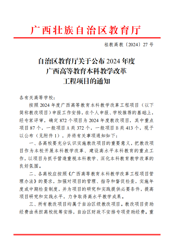 近日,广西壮族自治区教育厅印发《关于公布2024年度广西高等教育本科教学改革工程项目的通知》,法学与社会学院法律系文立彬副教授主持的“课程思政深度融入数字法学创新人才培养模式的建设与实践”、黎曦博士主持的“‘德法兼修’育人视域下《刑事诉讼法学》课程改革探索与实践”喜获自治区级教学改革工程一般项目A类立项。