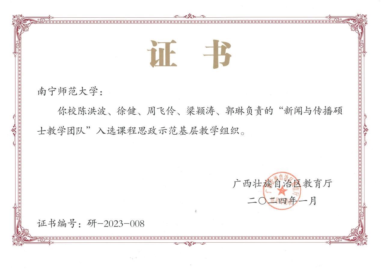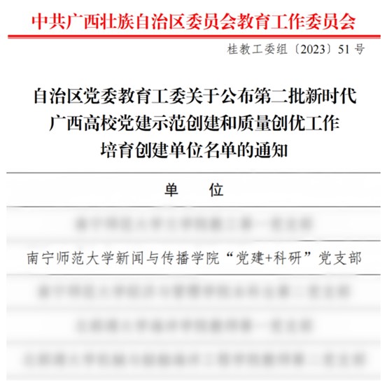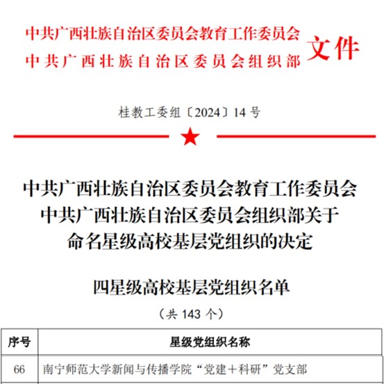 近日,南宁师范大学新闻与传播学院“党建+科研”党支部被命名为自治区“四星级高校基层党组织”,这是继新闻与传播学院“新闻与传播硕士教学团队”入选自治区级课程思政示范基层教学组织(研究生)后,新闻与传播学院立足“党建+科研+双创”人才培养模式下的又一重要成果。