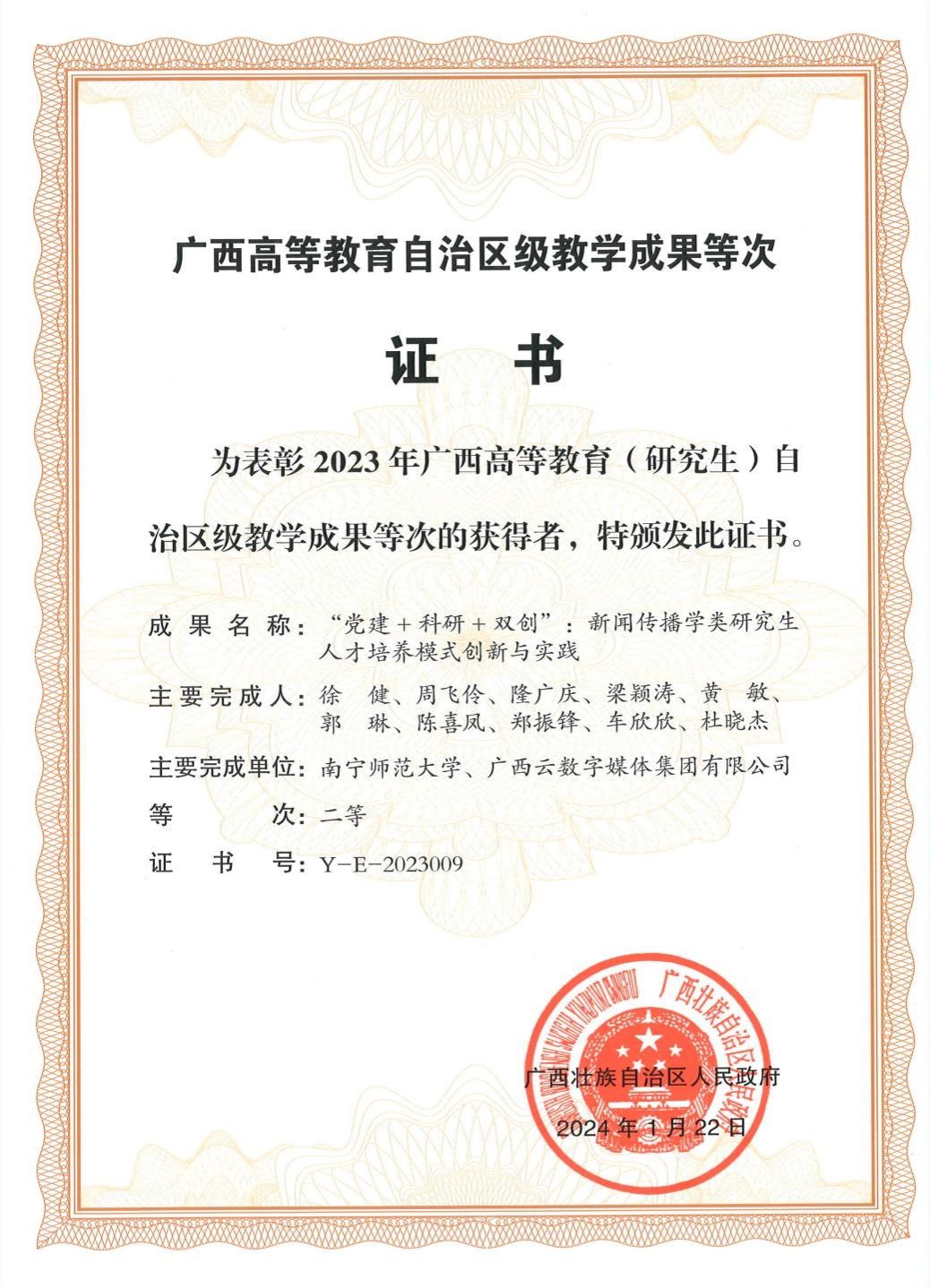 近三年,新闻与传播学院推动专业教育与思政教育有机结合,2项研究生教学成果荣获广西高等教育自治区级教学成果奖二等奖;教学团队先后主持承担14项教育部产学研项目,广西学位与研究生教育改革课题、广西研究生教育创新计划项目各1项,首批校级新文科研究与实践项目3项;1部教材获得广西社会科学优秀成果奖教材类三等奖,2部教辅用书获得广西社会科学优秀成果奖著作类三等奖;《红色文化融入新闻传播学课程思政的现实难点与实践路径》等多篇教改论文发表在国内中文核心期刊;《马克思主义新闻观》课程思政以学生为中心,以产出为导向,从目标、教学结构、考评上都作了精心的布置,受到学生一致好评,获评校级示范课程。学院整体的教学水平得到显著提升。