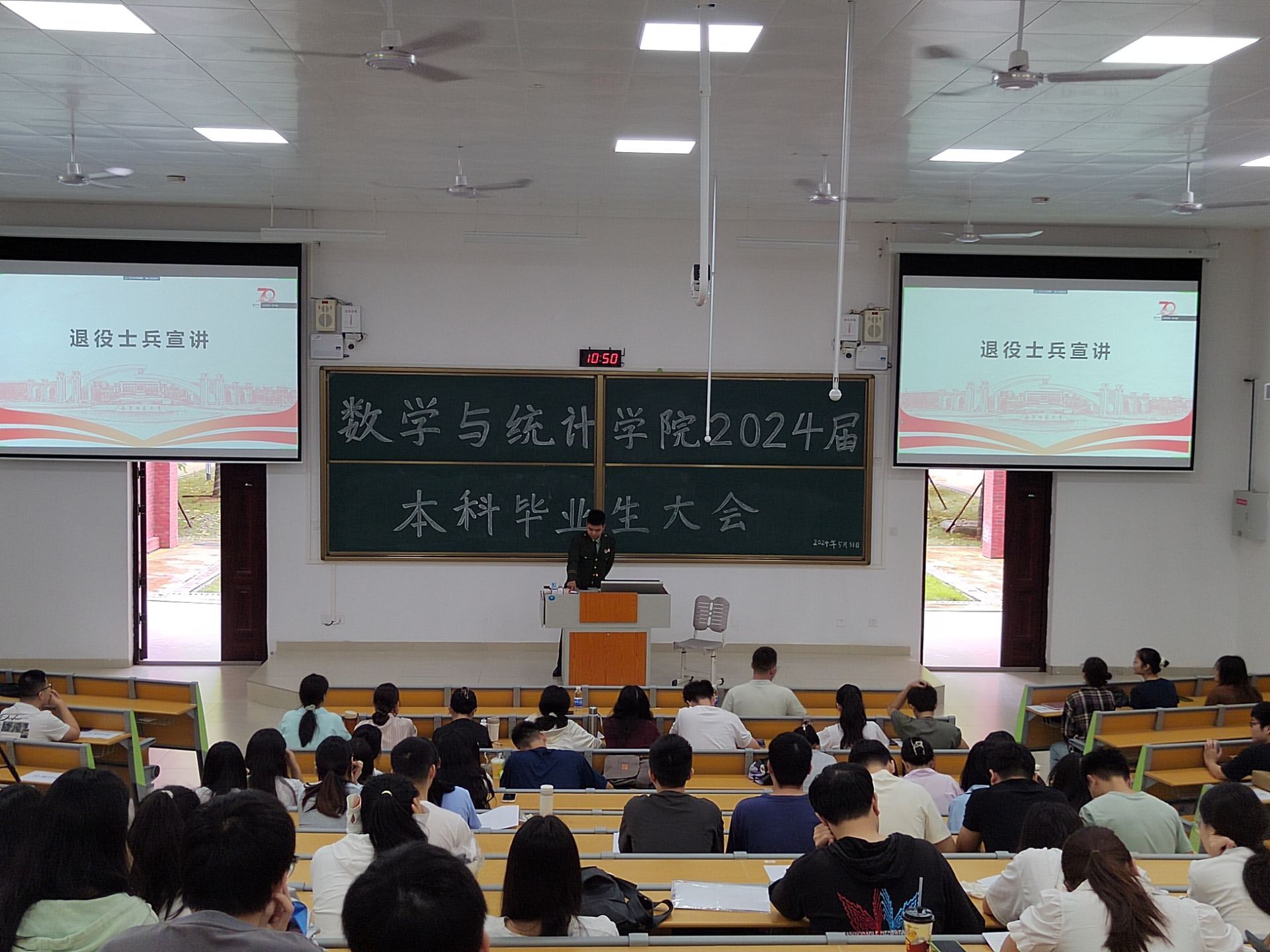 为响应国家号召,激发广大学子的参军入伍报国热情,5月31日晚,数学与统计学院在实验楼2-A105教室组织毕业生征兵宣讲活动。